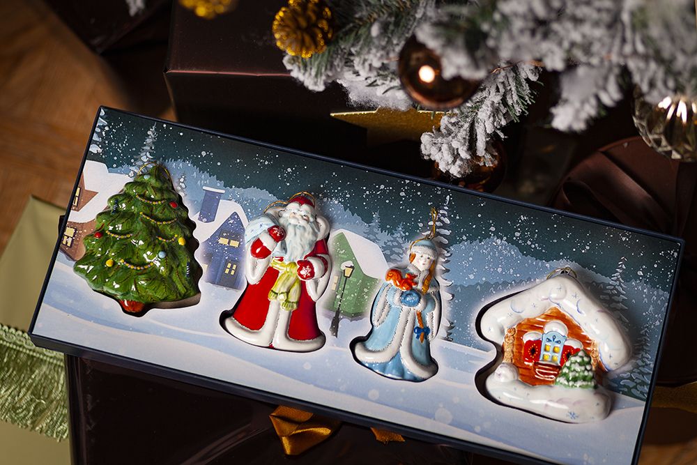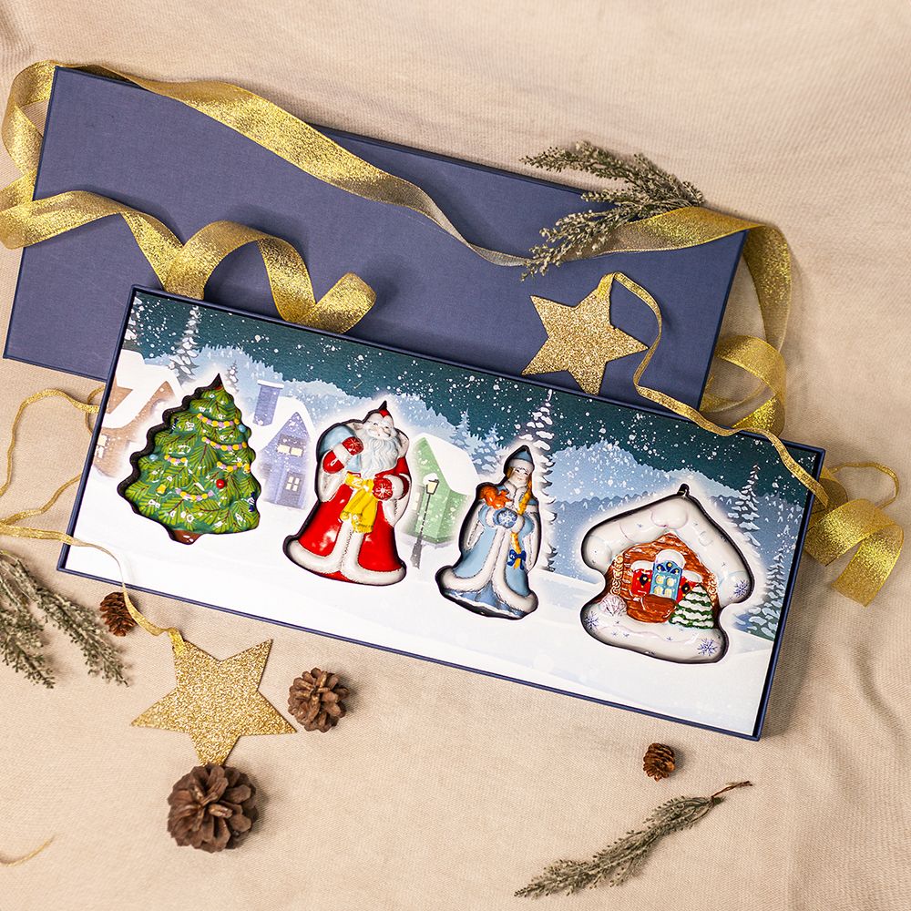 Это изделие представляет набор елочных игрушек ручной работы. В набор “Коллекция плоских изделий” входят четыре игрушки. Художники расписали для Вас нарядную Ёлку, Деда Мороза и Снегурочку, Зимнюю избушку. Каждая игрушка — это уникальное сочетание гармоничной формы, узнаваемого образа и мастерского исполнения. Традиционные персонажи волшебного торжества ассоциируется с благополучием, приносят любовь и сближают людей. Набор «Новый год» будет отличным выбором для украшения вашей елочки, он будет звездой коллекции елочных игрушек. Набор «Новый год» станет прекрасным подарком на Новый год и Рождество вашим близким, друзьям и коллегам.