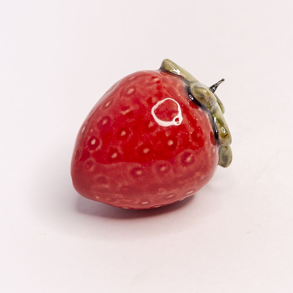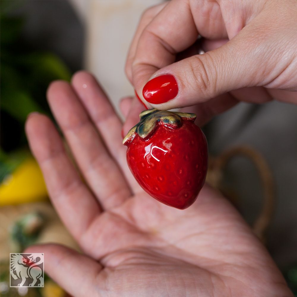 Изделие ручной работы представляет красивую клубничку. Клубника – это не только вкусная и ароматная ягода, издавна она считается символом изобилия и богатства, именно поэтому клубнику использовали для создания амулетов на улучшения благосостояния. Благодаря эффекту природного афродизиака, практики также включали ягоду в приворотные зелья. Красивая керамическая клубничка станет украшением вашего интерьера, будет замечательным подарком. Соберите всю коллекцию ярких и красивых фруктов и овощей. Блюдо с фруктами или овощами может быть использовано для создания эффектных интерьеров в кафе, ресторанах, барах или как модель на уроках рисования.