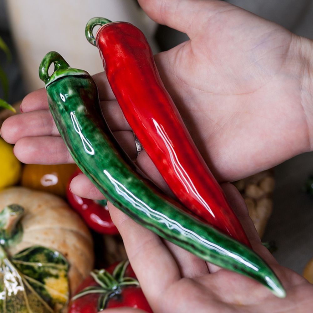 Изделие ручной работы представляет перец в натуральную величину. Художник воспользовался всей роскошной палитрой современных керамических глазурей, и перец выглядит совершенно, как настоящий. Перец – не только полезный и вкусный овощ, он ещё является мощным магическим растением, действие которого проявляется, прежде всего, в сердечных делах, эзотерики советуют использовать магические свойства горького, острого овоща, чтобы разжечь чувства, уберечь отношения от сглаза. Данное изделие станет украшением вашего интерьера, будет интересным подарком. Соберите всю коллекцию ярких и красивых фруктов. Блюдо с фруктами или овощами может быть использовано для создания эффектных интерьеров в кафе, ресторанах, барах или как модель на уроках рисования.