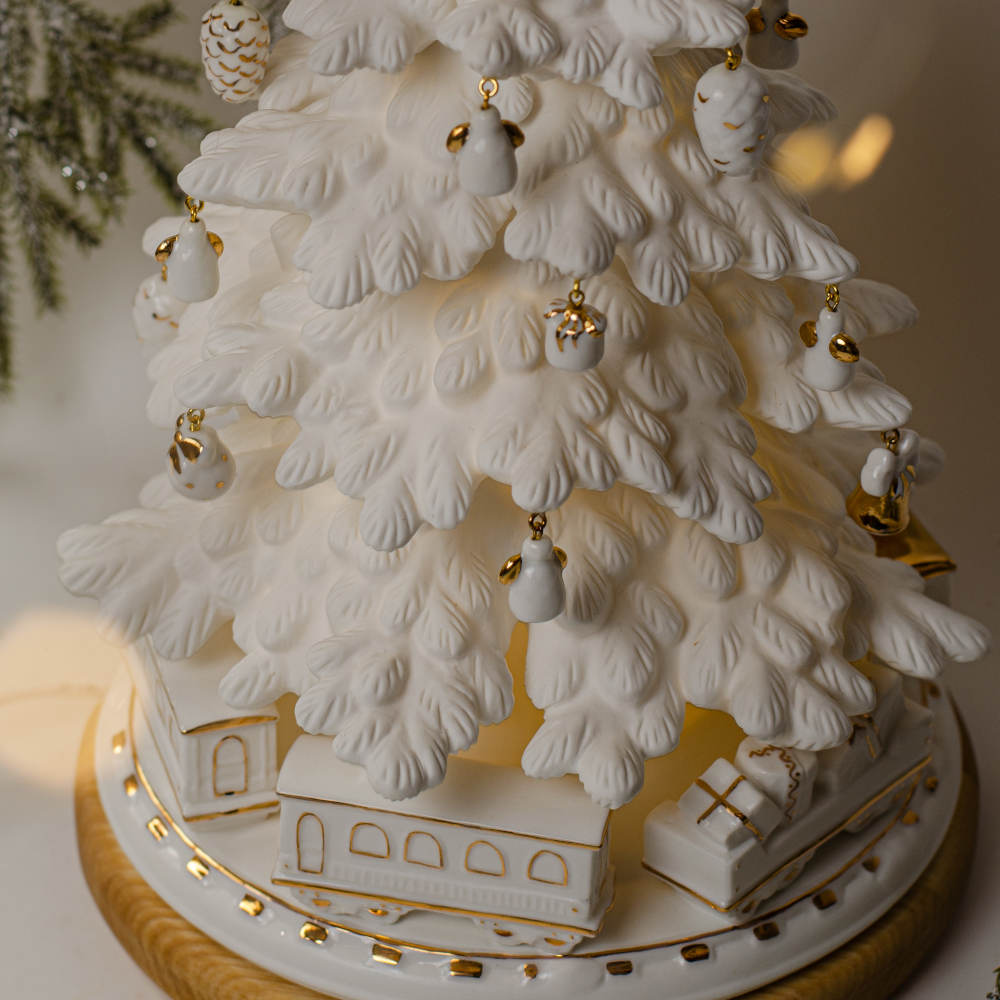 Светильник «Ёлка» выполнен из фарфора бисквита и установлен на деревянное основание. Изделие украшено подвесными миниатюрными игрушками и вручную расписано золотом, что придаёт ему изысканный и праздничный вид. Встроенная электрическая свеча мягко подсвечивает ёлку изнутри, создавая тёплый и уютный свет, который наполняет пространство атмосферой праздника.