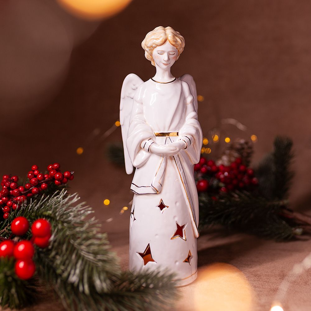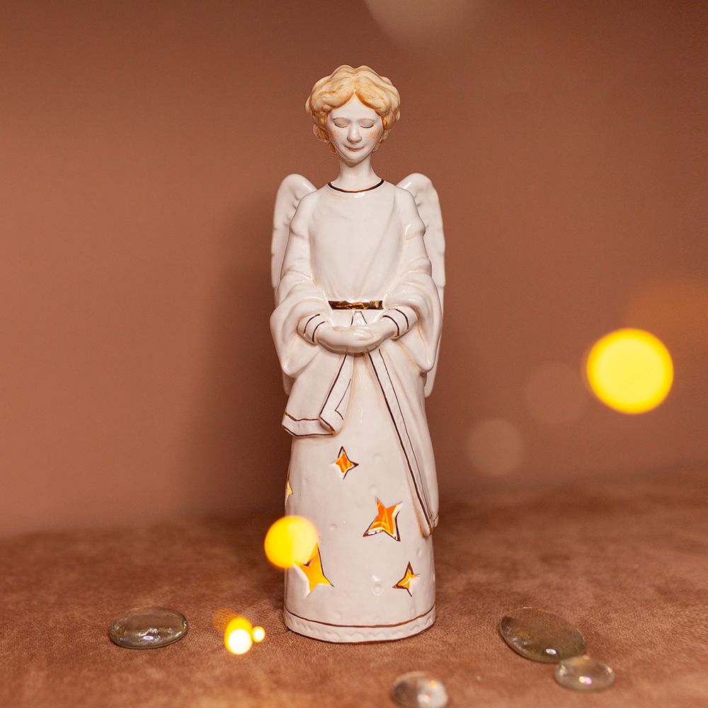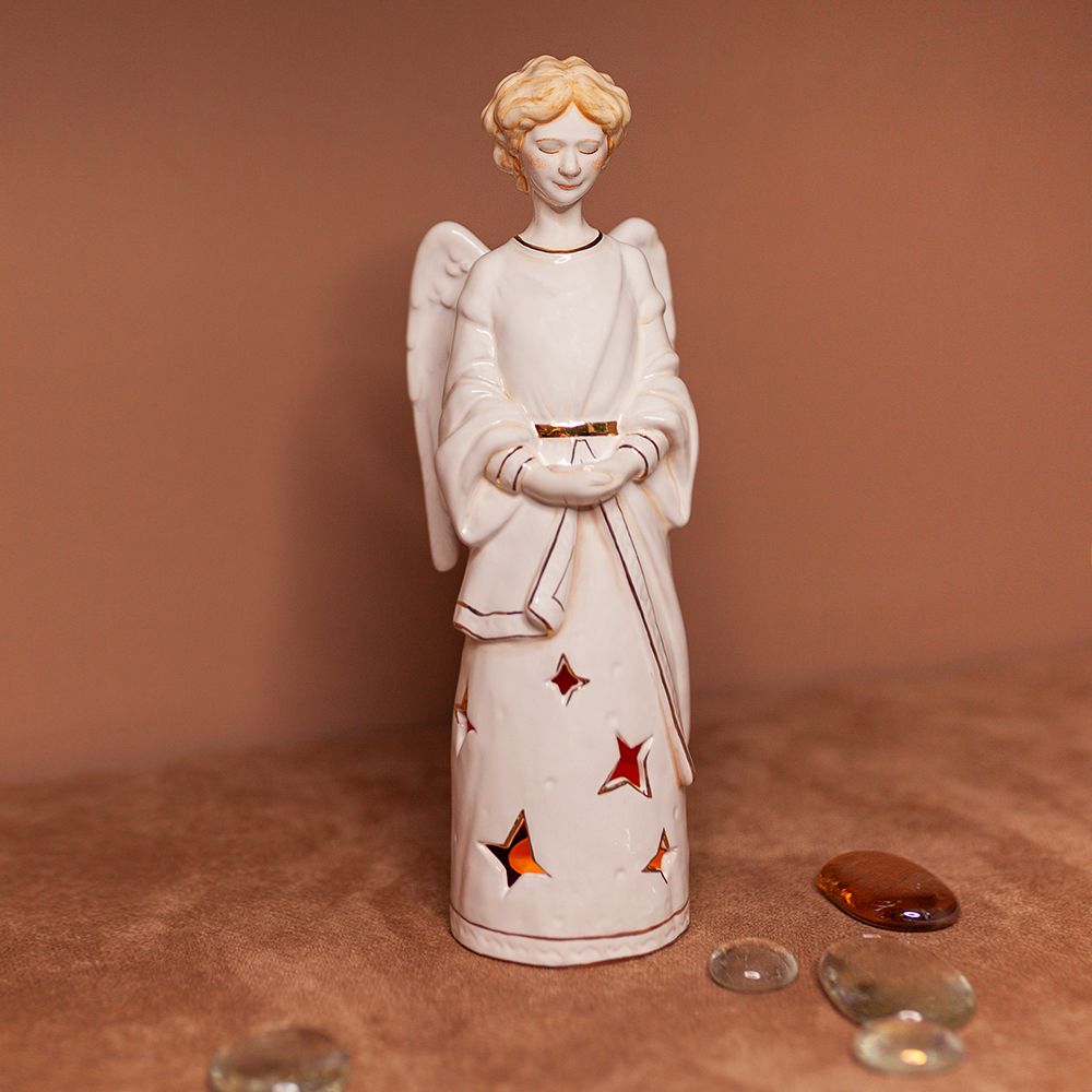 Это изделие ручной работы представляет собой подсвечник со звездами в виде ангела ручной работы, которая с любовью расписана. Гармоничное сочетание красок успокаивает, и приносит особое настроение ожидания чуда. Ангел представлен в простом и понятном облике, со светлыми волосами и нежной улыбкой. Станет прекрасным подарком на именины, свадьбы, Новый год, Рождество, Пасху и другие праздники. Принято считать, что Ангелы избавляют от опасности, помогают преодолеть трудности, наполняют нашу жизнь миром и любовью. Наш Ангел словно излучает тепло. Изображения ангела принято дарить на удачу, так же Ангелы избавляют от опасности. Ангел станет особенным акцентом в интерьере и украшением Вашей коллекции керамики.