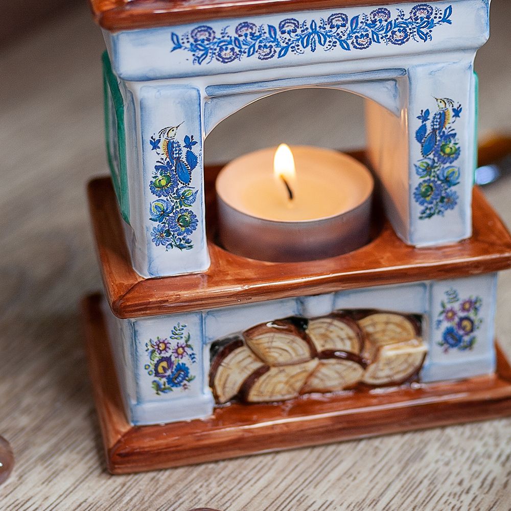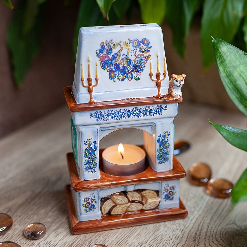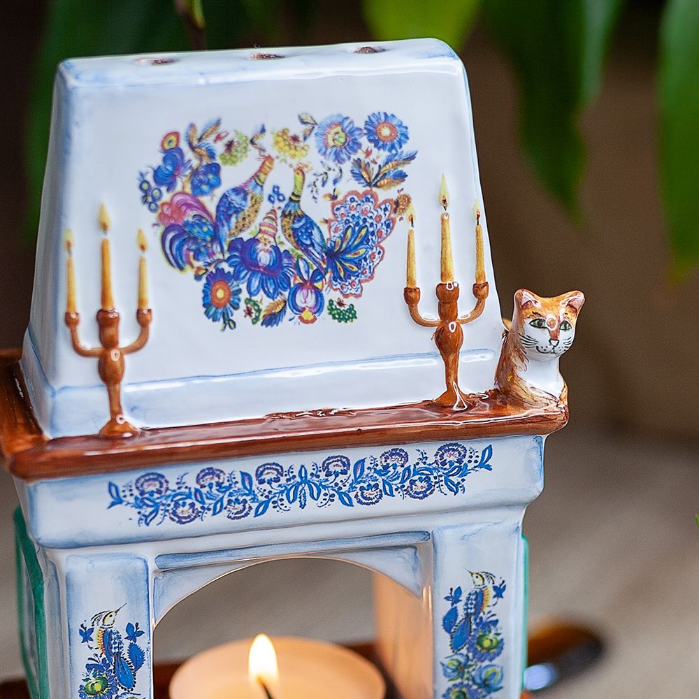Изделие ручной работы выполнено в виде камина с красочным цветочным орнаментом, на котором удобно расположился рыжий кот. Подсвечник может быть использован для украшения интерьера, создания уюта и романтического настроения, его оценят и любители, и коллекционеры. Замечательный подарок к Рождеству, Новому году, дню рождения или любому другому событию.