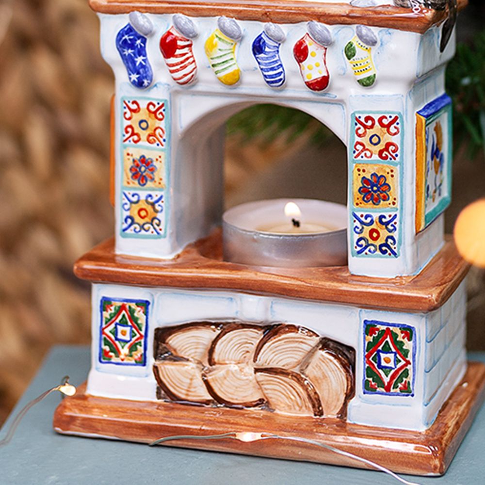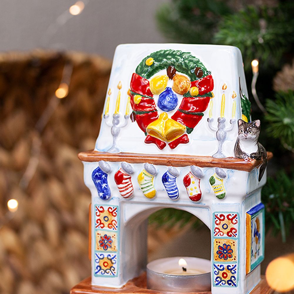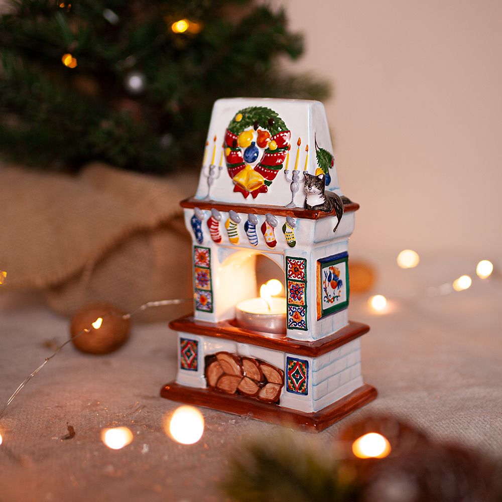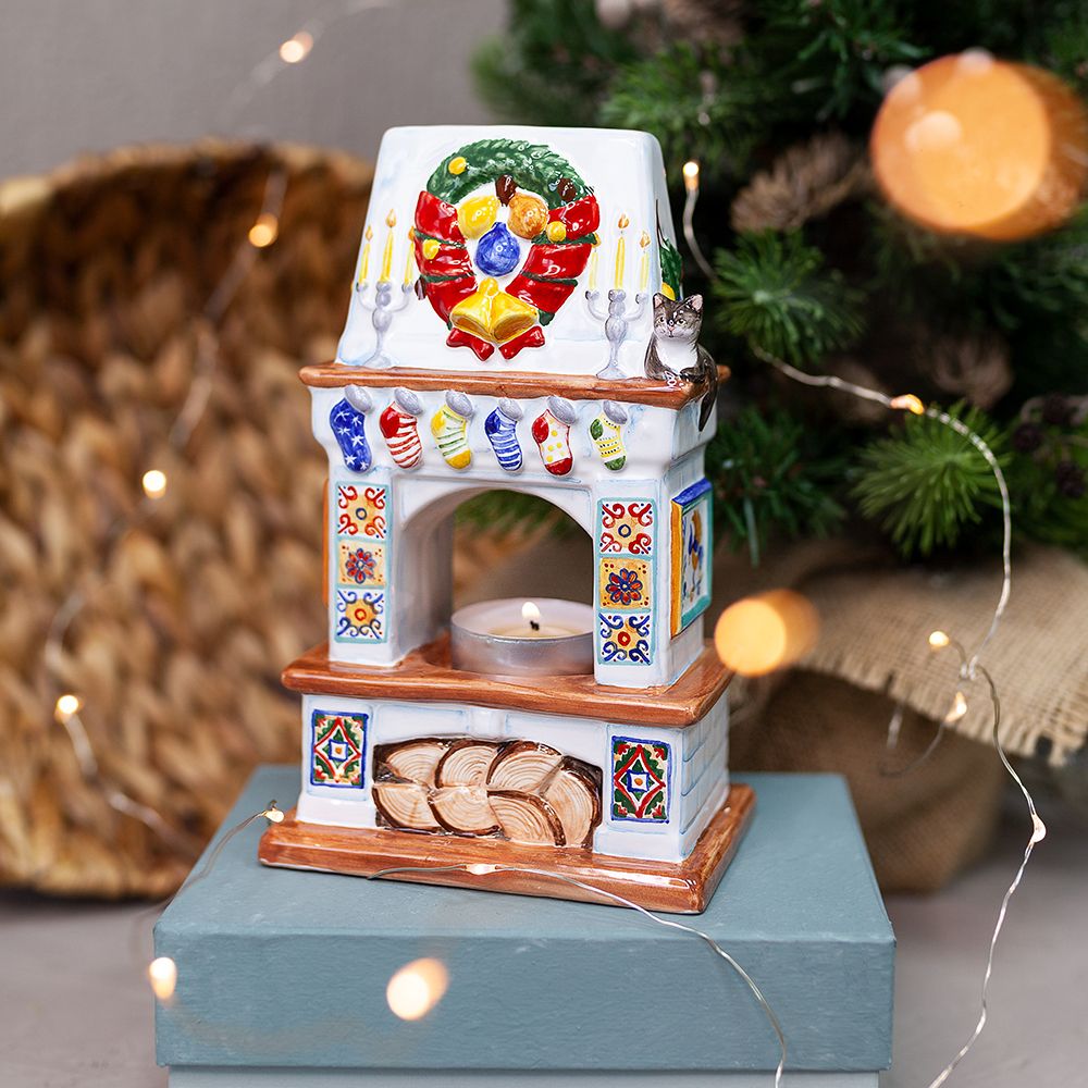 Изделие ручной работы выполнено в виде камина с красочными изразцами, свечами, украшенного рождественским венком и носками для подарков. Подсвечник может быть использован для украшения интерьера, создания уюта и романтического настроения, его оценят и любители, и коллекционеры. Замечательный подарок к Рождеству, Новому году, дню рождения или любому другому событию.