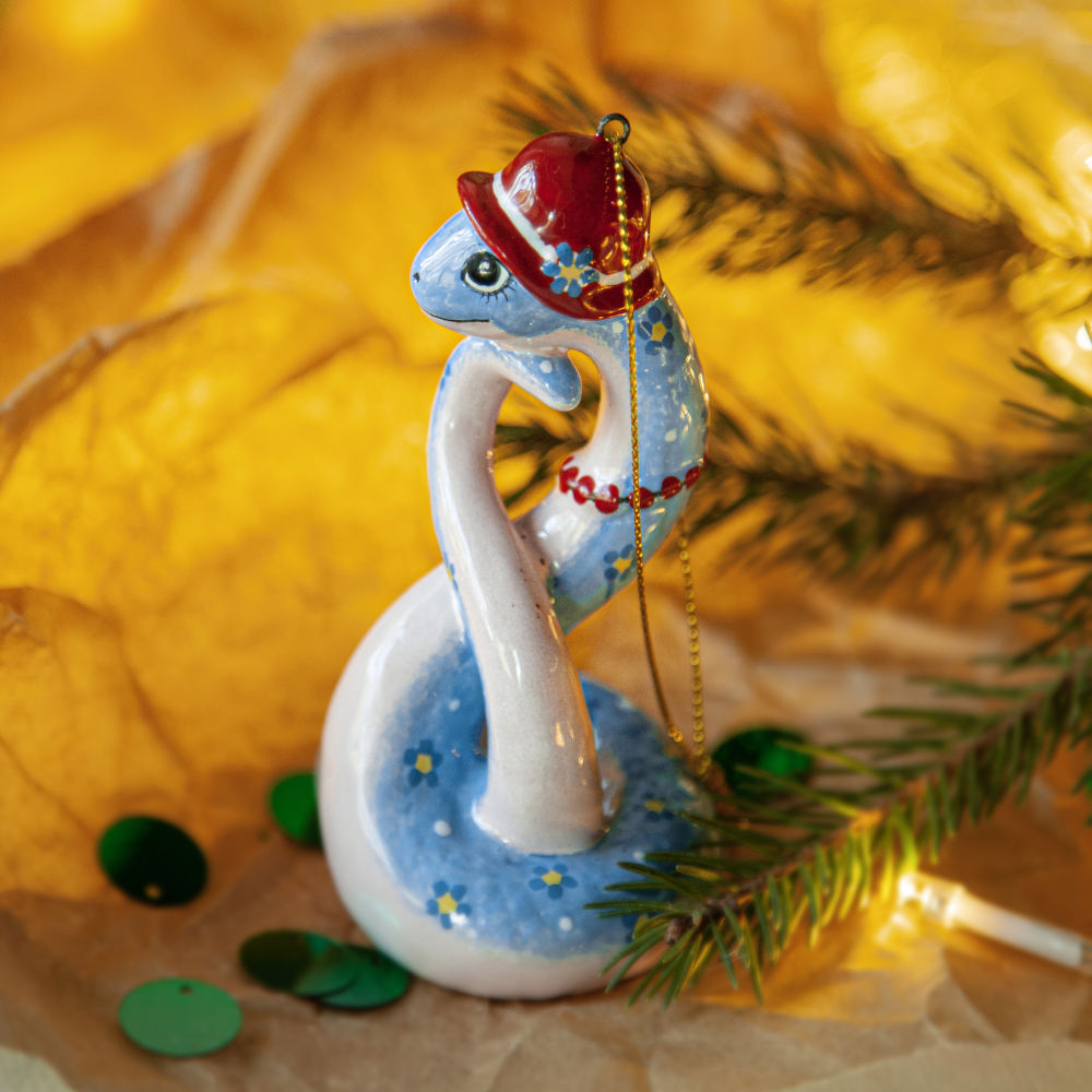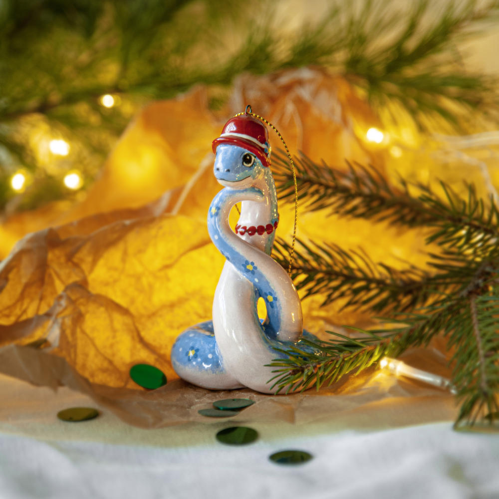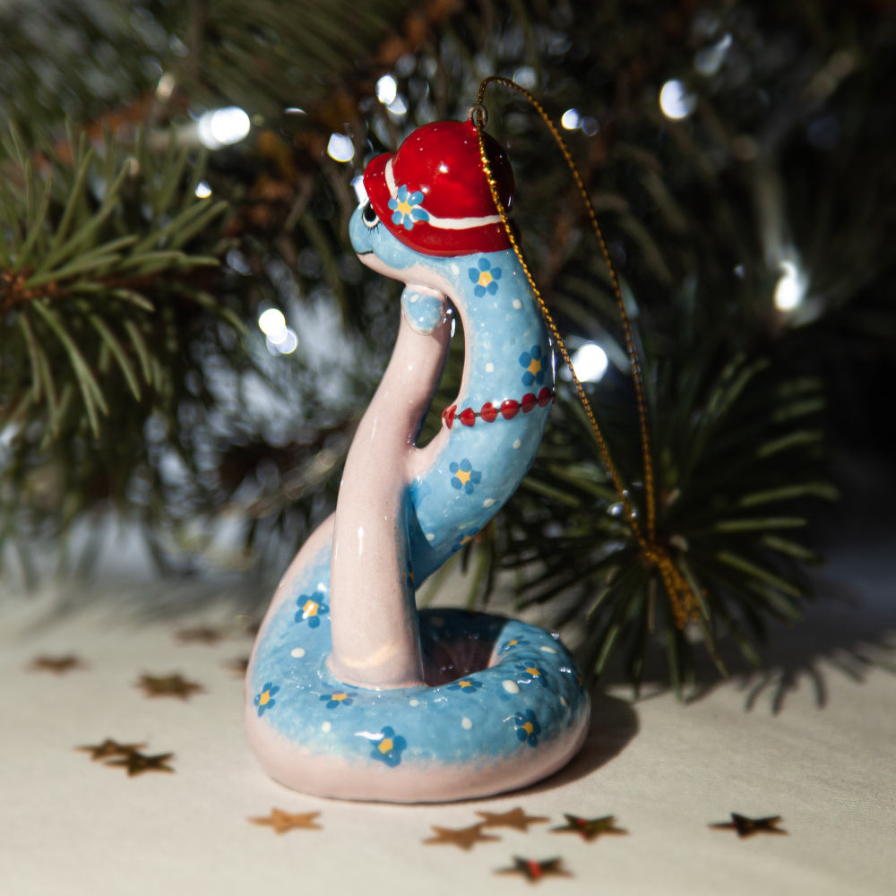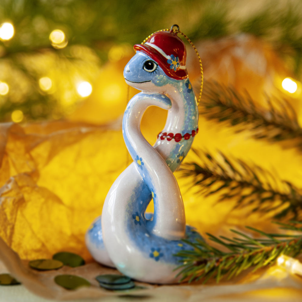 “”Змейка в шляпке”” – прекрасно украсит новогоднюю елку, а также станет необычным подарком для друзей, коллег и коллекционеров керамики. Он расскажет о вашем тонком вкусе и оригинальности, а ее загадочность – прекрасное начало нового года.”
