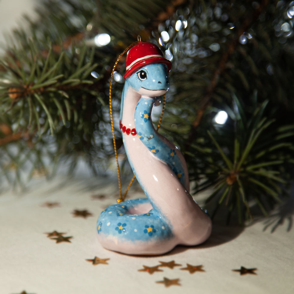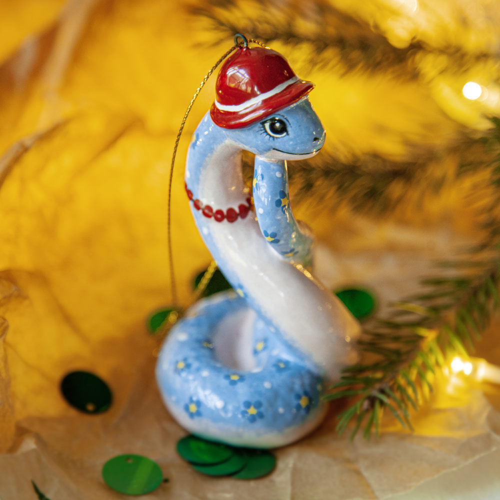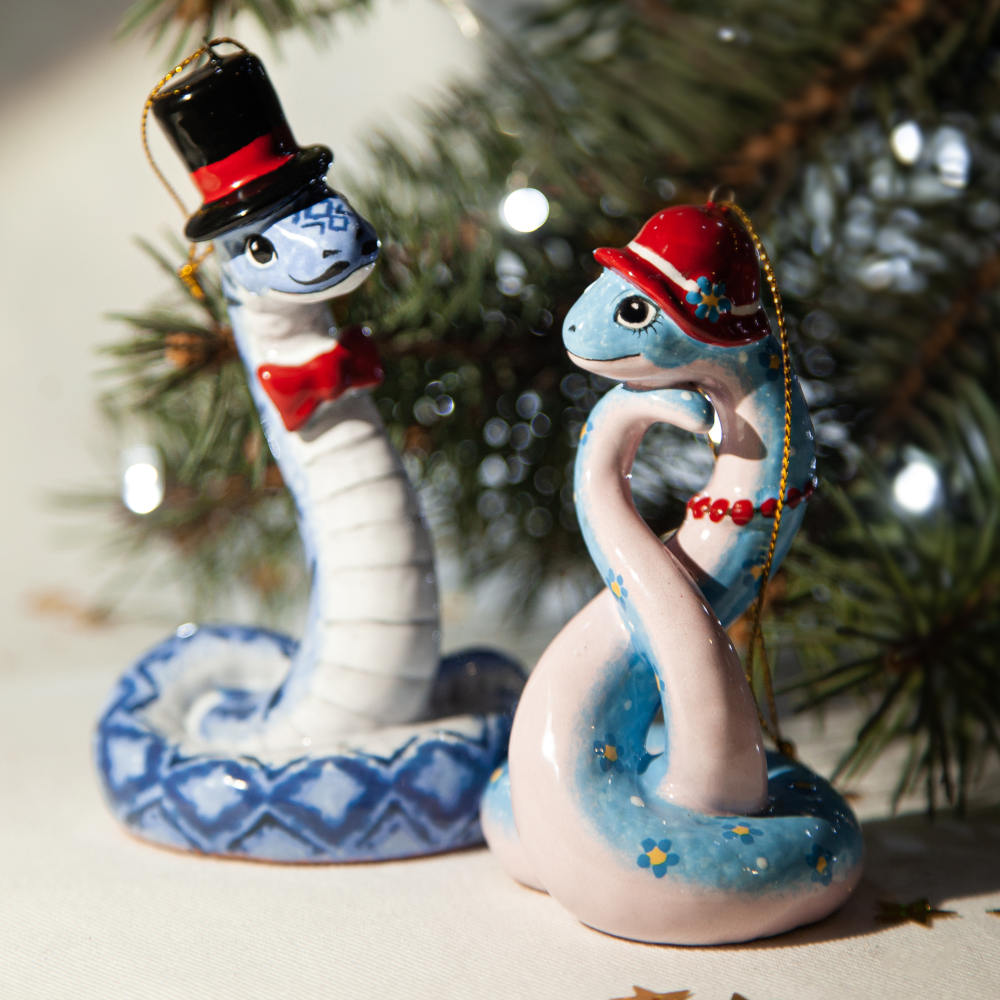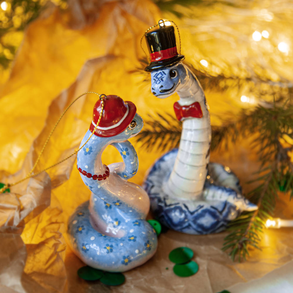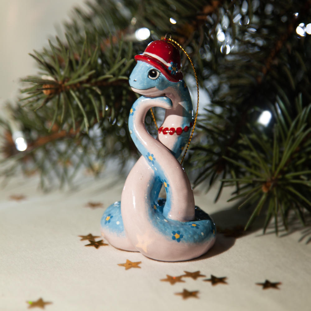 “”Змейка в шляпке”” – прекрасно украсит новогоднюю елку, а также станет необычным подарком для друзей, коллег и коллекционеров керамики. Он расскажет о вашем тонком вкусе и оригинальности, а ее загадочность – прекрасное начало нового года.”