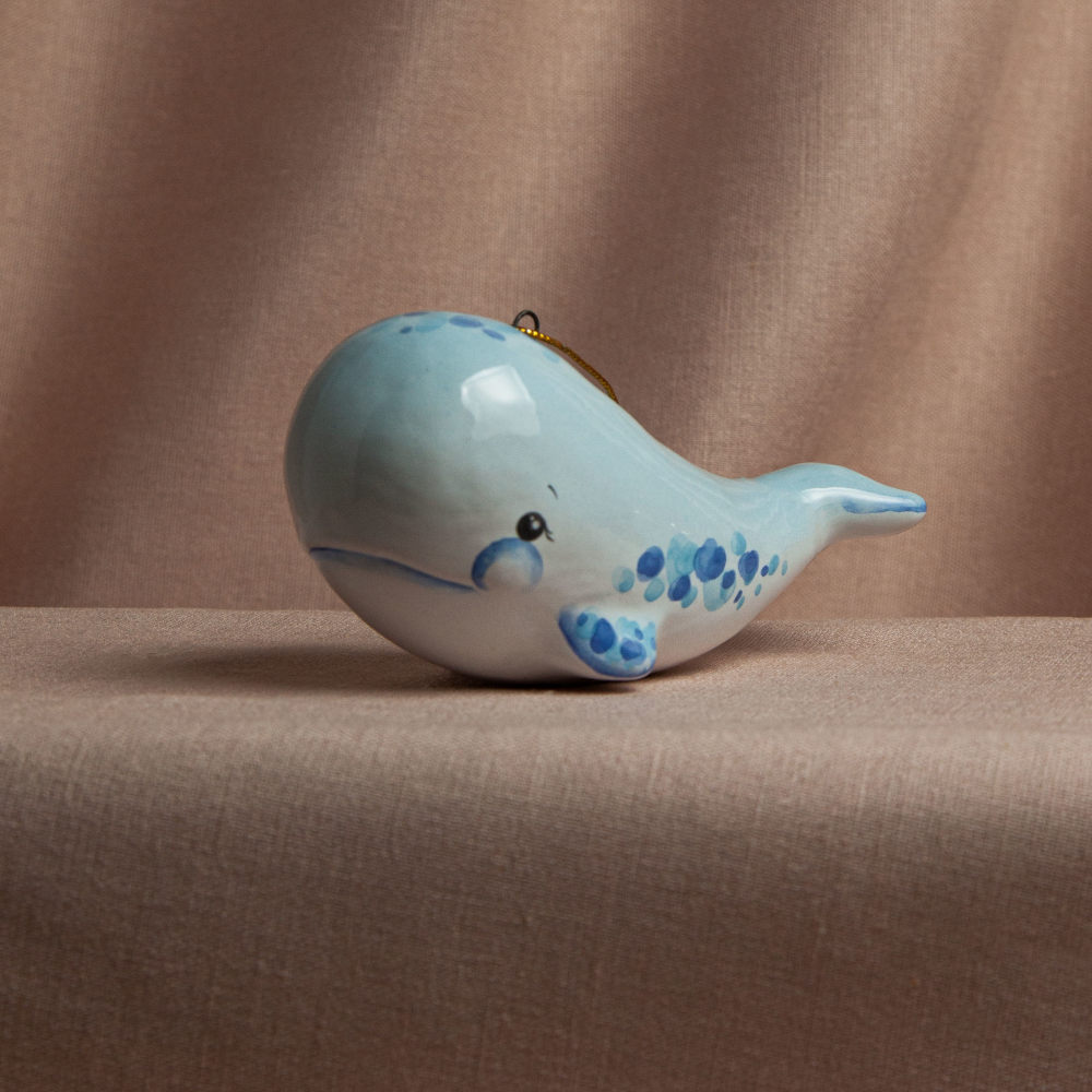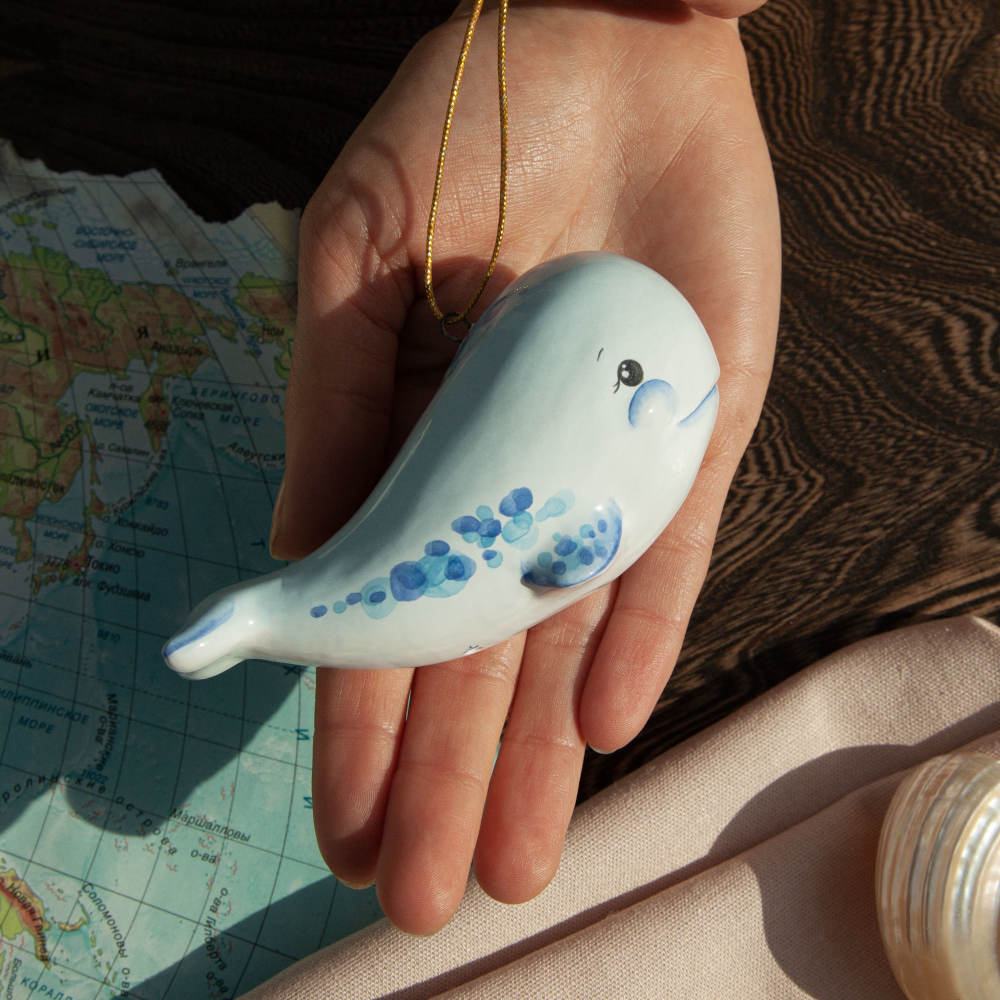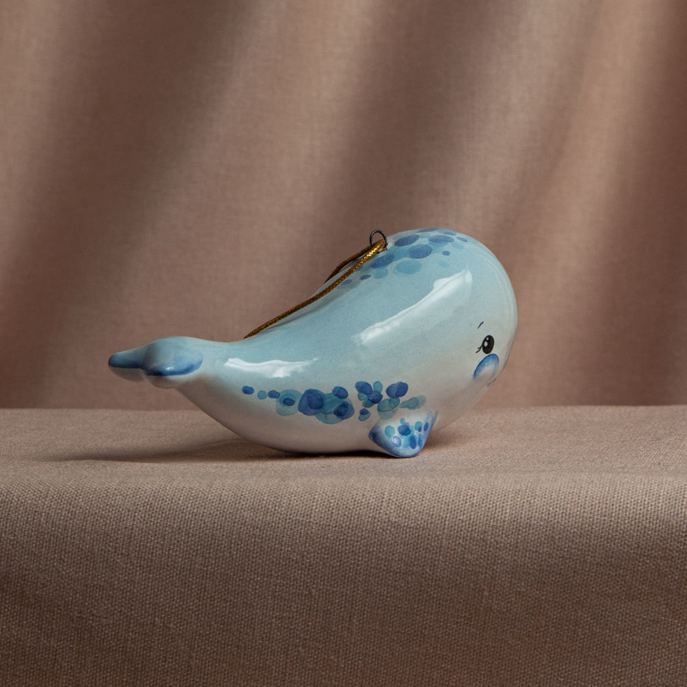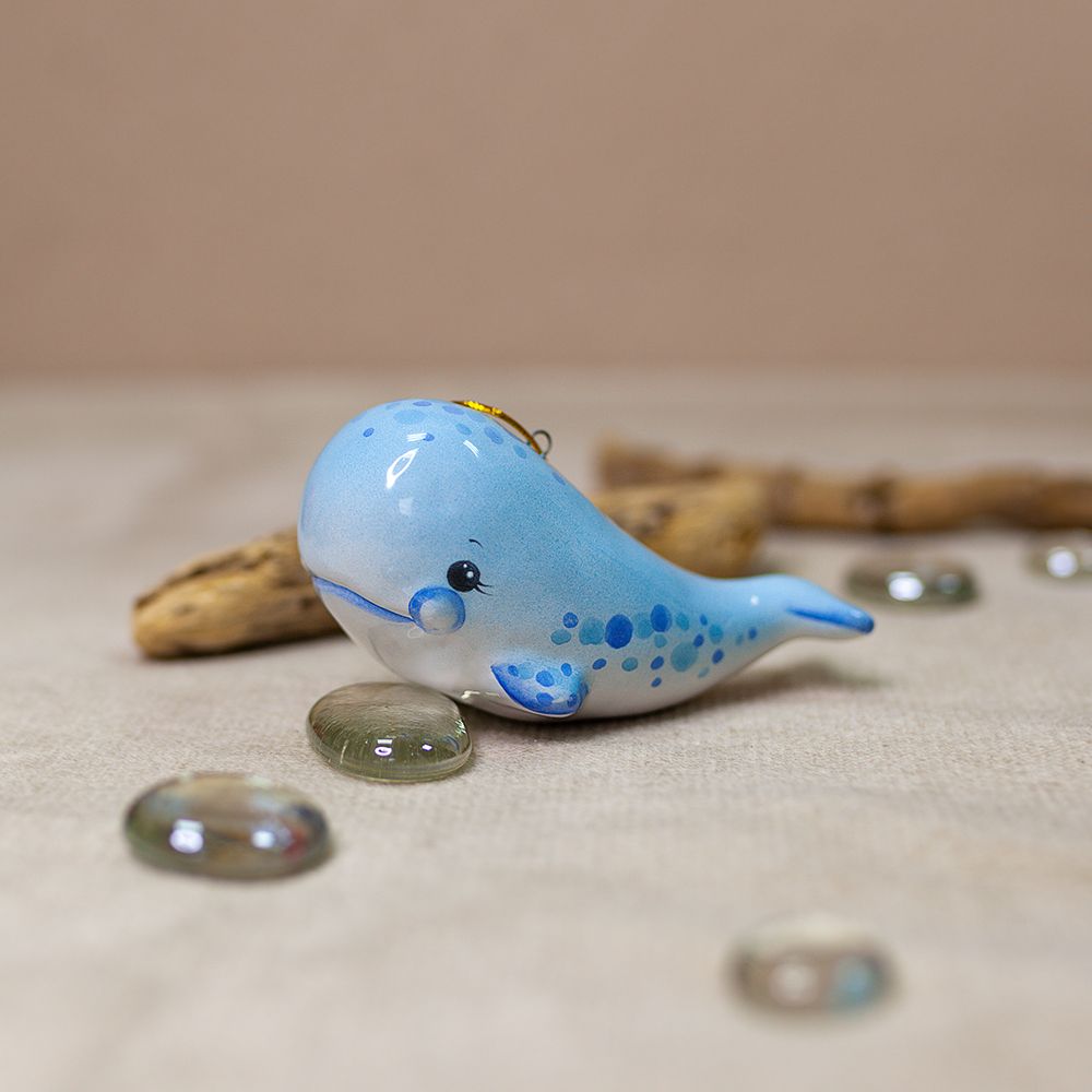 Это изделие ручной работы представляет собой фигурку маленького симпатичного голубого китенка. Кит – очень благоприятный символ спасения, сохранения и созидания, поскольку вся жизнь появилась из воды. Китенок прекрасно украсит новогоднюю елочку, станет чудесным подарком на Новый год, а также на любой другой праздник.