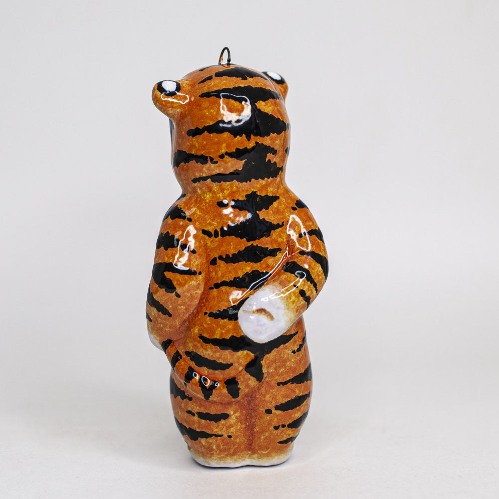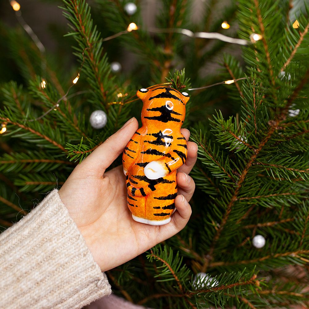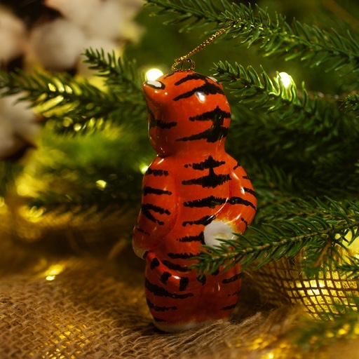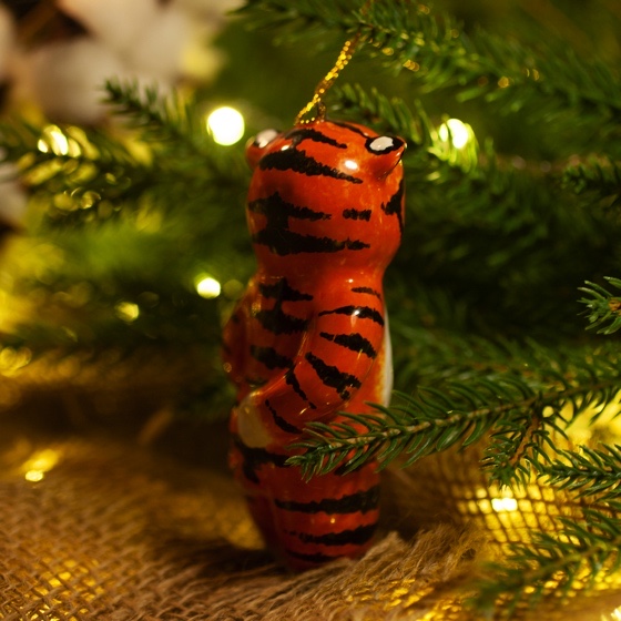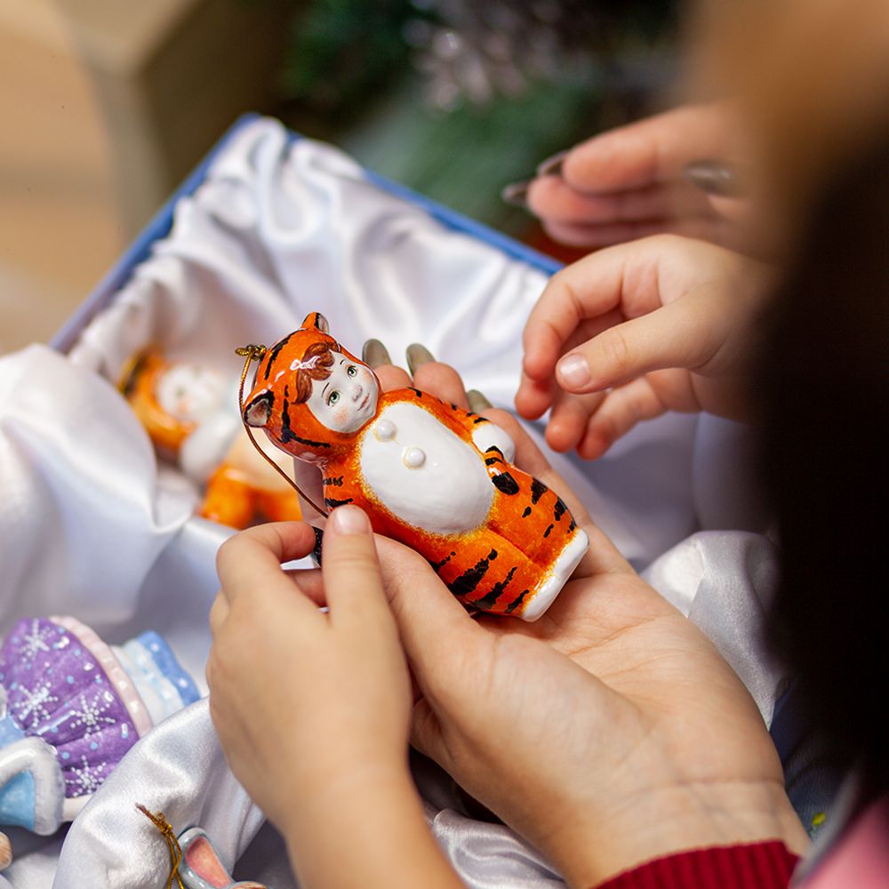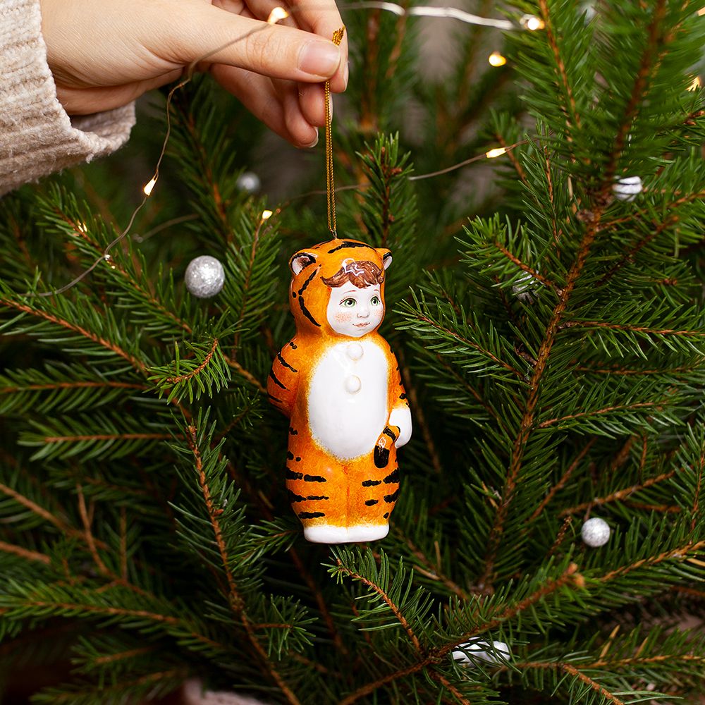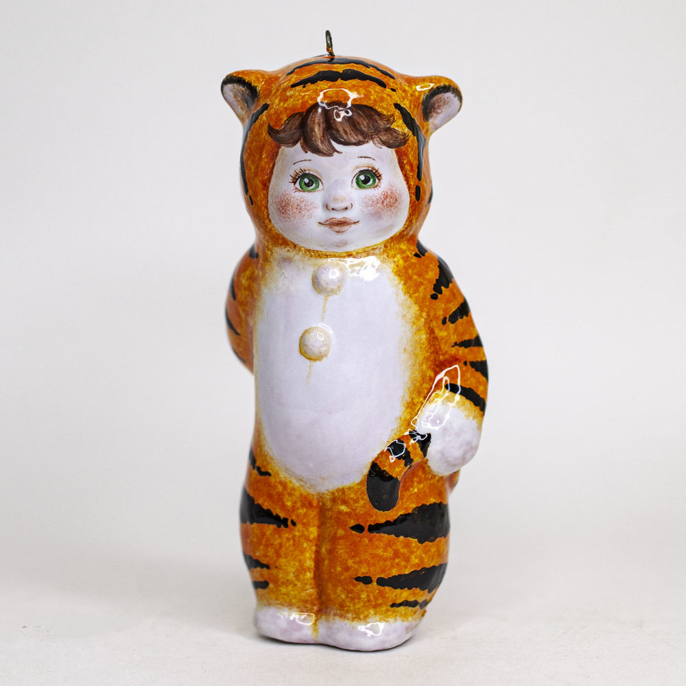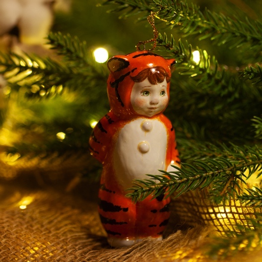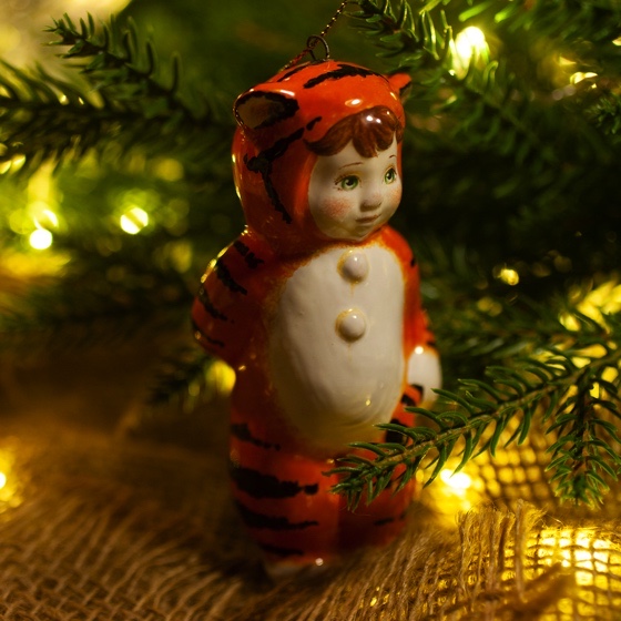 Изделие представляет фигурку малыша в костюме тигренка. Выражение лица, поза выдают застенчивость малыша, он выглядит милым и беззащитным, несмотря на костюм, но это только придает очарования. Это чудесное изделие будет прекрасным украшением новогодней елочки, идеальным подарком на рождение ребенка и Новый год, добавит шарма в убранство дома, порадует коллекционеров.