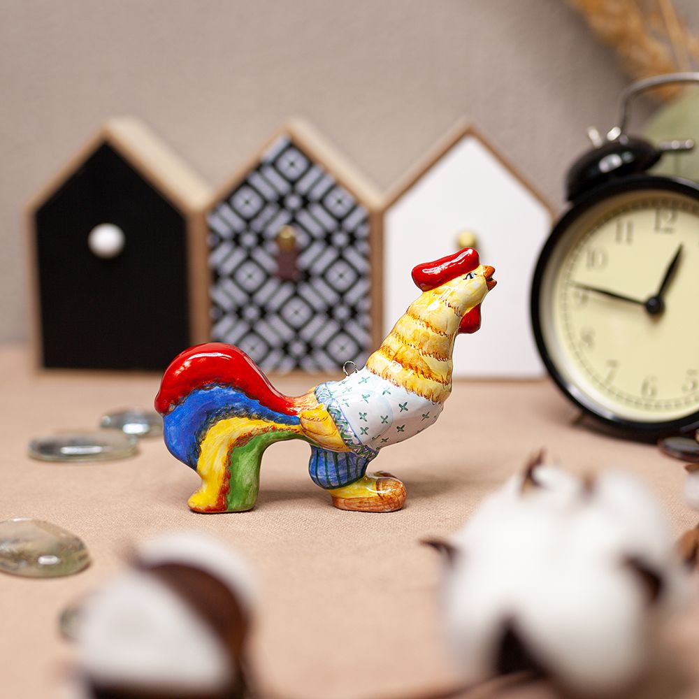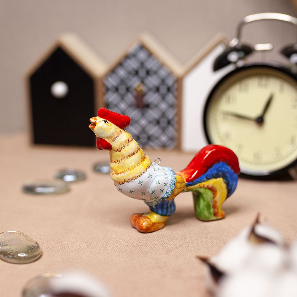 Данное изделие ручной работы входит в коллекцию Символы Года и представляет фигурку петушка с ярким оперением в расшитой русской рубахе-косоворотке. Петух – это славянский символ огня и солнца. На Руси петуха дарили на новоселье, вышивали его образ на свадебных полотенцах. Петух оберегает дом от нечистой силы и от пожара, помогает хозяйке вести домашнее хозяйство. А ещё, Петух – это вестник нового дня, пробуждающий человека ото сна. Игрушка Петушок – это замечательное украшение для интерьера, которое привлечет внимание яркой окраской и создаст праздничное настроение. Данная игрушка – это ещё и изящный подарок к Рождеству и Новому году, особенно в год Петуха.