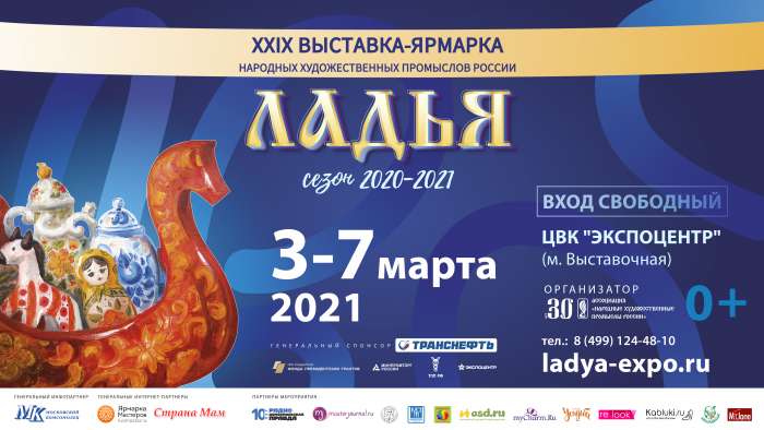 С 3 по 7 марта 2021 года в ЦВК «Экспоцентр» пройдет крупнейшая в стране выставка-ярмарка народных художественных промыслов «ЛАДЬЯ. Сезон 2020-2021», которая состоится при соблюдении всех необходимых мер безопасности по предупреждению распространения новой коронавирусной инфекции (COVID-19). Выставка организуется Ассоциацией «Народные художественные промыслы России», при поддержке Министерства промышленности и торговли Российской Федерации, Торгово-промышленной палаты Российской Федерации.