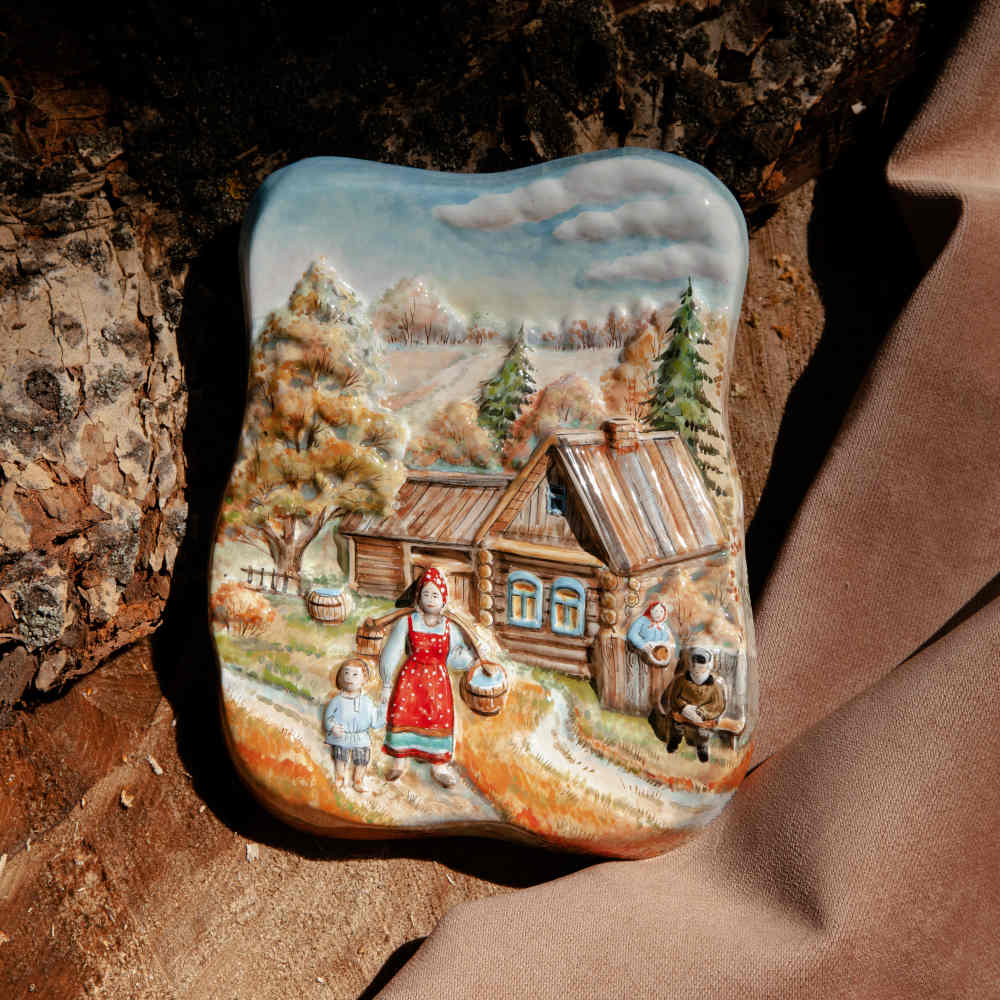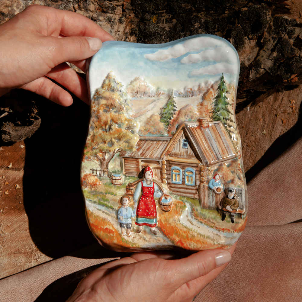 Рельеф “”Деревенская осень (малая с бабой)”” изготовлен в технике майолика и украшен ручной художественной росписью. Мастером очень тонко изображена жизнь русской деревни – самобытные жители и их повседневный быт, маленький деревянный домик за околицей, речка вдалеке, в обрамлении желтых полей и деревьев – тихая прелесть осеннего пейзажа. Каждая деталь и фигура на изделии, заставляет задуматься и воссоздает образы повседневной жизни нашего народа. Этот керамический рельеф станет не только прекрасным украшением для интерьера, но и настоящим произведением искусства, которое будет радовать и вдохновлять своего владельца каждый день. Благодаря своей уникальности и характеру, это изделие станет превосходным подарком для настоящего ценителя искусства и традиций.”