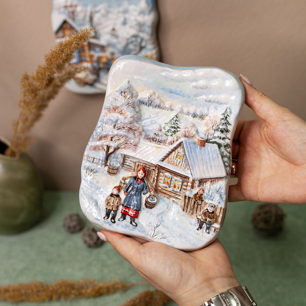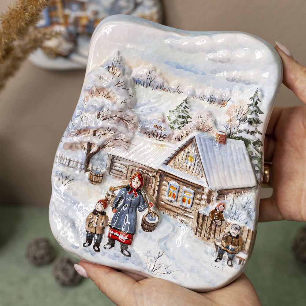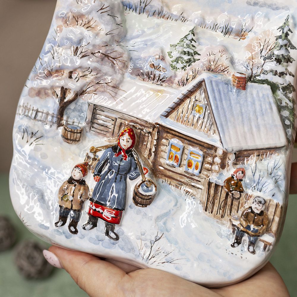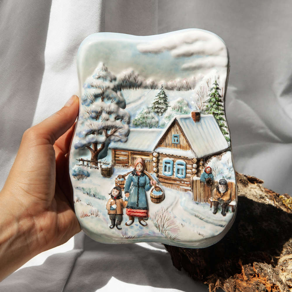 Рельеф “Деревенская зима” (малый с бабой) изготовлен в технике майолика и украшен ручной художественной росписью. Мастером очень тонко изображена жизнь русской деревни – самобытные жители и их повседневный быт, маленький деревянный домик за околицей, и захватывающая дух красота русской зимы, с шапками пушистого снега на крышах домов и деревьев. Каждая деталь и фигура на изделии, заставляет задуматься и воссоздает образы повседневной жизни нашего народа. Этот керамический рельеф станет не только великолепным украшением для интерьера, но и настоящим произведением искусства, которое будет радовать своего владельца душевным теплом и ностальгией за прошлыми временами. Он станет уникальным подарком, который подчеркнет изысканный вкус и внимательное отношение к традициям и наследию.