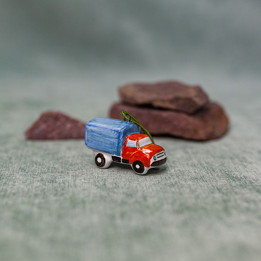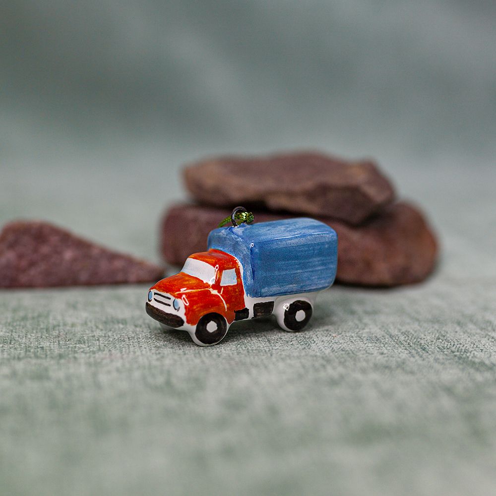 Елочный мини подвес “”Грузовичок””, изготовлен в технике майолика, украшен ручной художественной росписью и входит в набор елочных украшений “”Ретротранспорт””. Каждая деталь грузовичка, мастерски прорисована художниками, что подчеркивает его красоту и изящество. Игрушка идеально подойдет для украшения новогодней ёлки. Также станет прекрасным подарком для автолюбителей и коллекционеров керамических изделий ручной работы.”