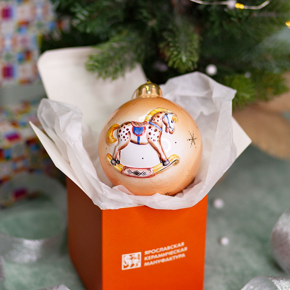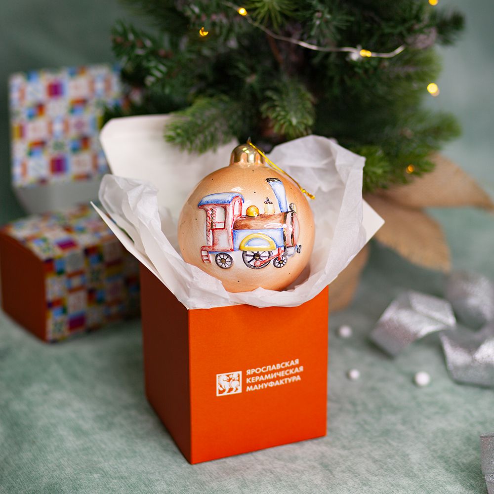 Эксклюзивное изделие ручной работы представляет собой шар с рельефным изображением с одной стороны яркого игрушечного паровоза, с другой – лошадки качалки «в яблоках». Обе игрушки эффектно смотрятся на оранжевом фоне, а позолота добавляет выразительности. Искусно изображенные ретро игрушки вызывают воспоминания, ностальгию, и в то же время радость. Такие шары будут изысканно смотреться как на самой новогодней ели, так и в гирляндах, украшающих двери, лестницы, и, конечно в праздничных композициях. Они создадут настроение, добавят волшебного очарования и магии любому интерьеру, будут незабываемым подарком к Новому году и Рождеству, который будет оценен по достоинству и подчеркнёт вкус дарителя.