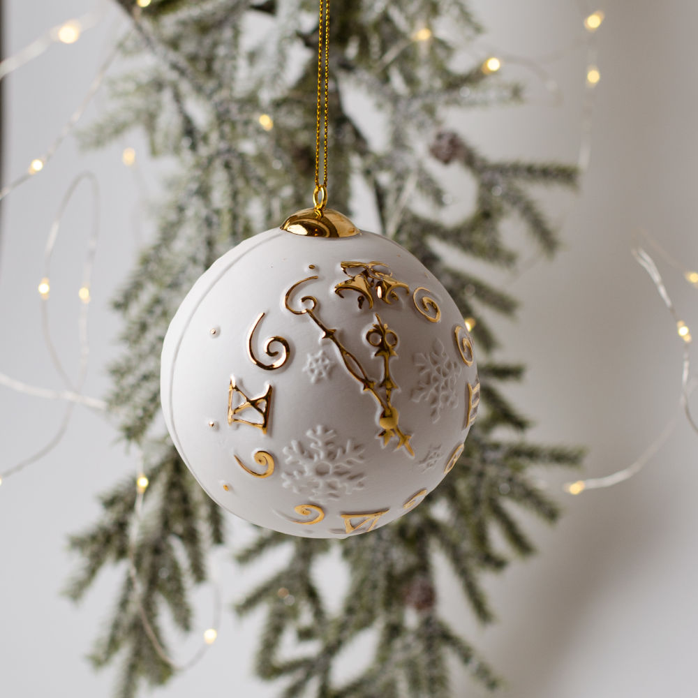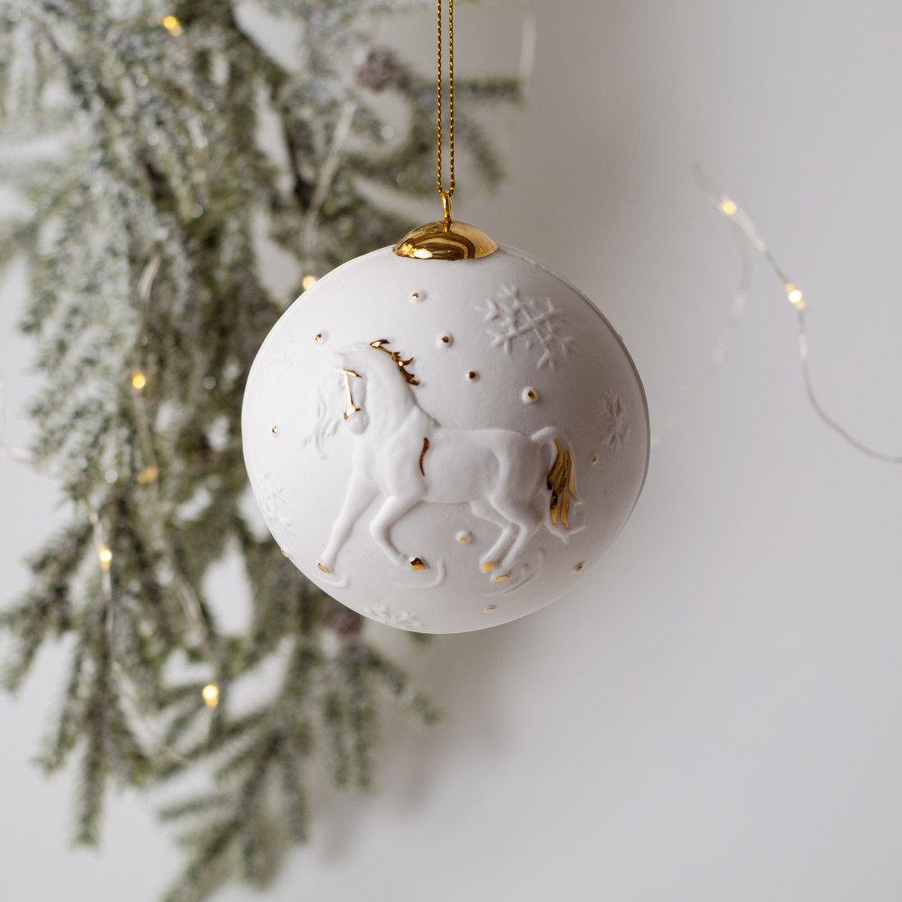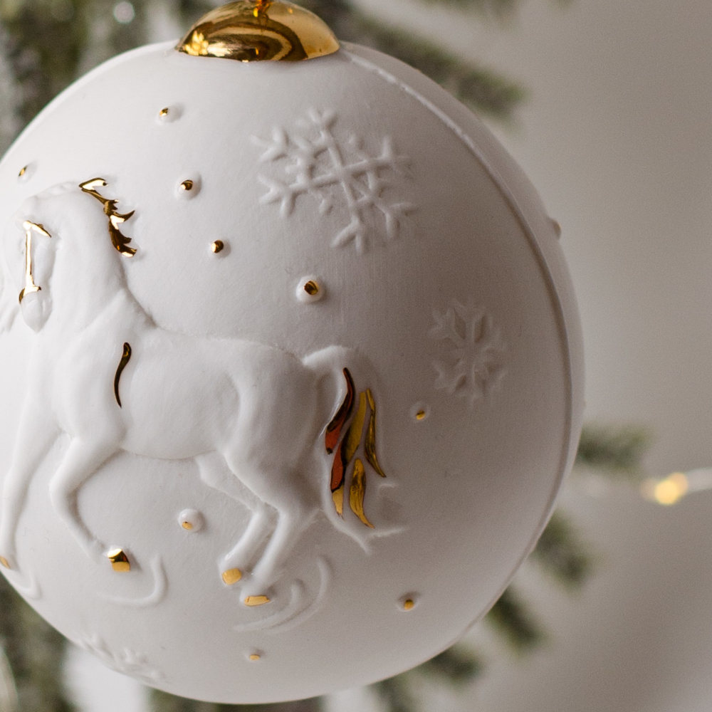 Эксклюзивный шар ручной работы выполнен из фарфора бисквита и украшен высокохудожественным рельефным изображением лошади — символа наступающего года. Легкие золотые линии, придают изделию особую утонченность и элегантность.