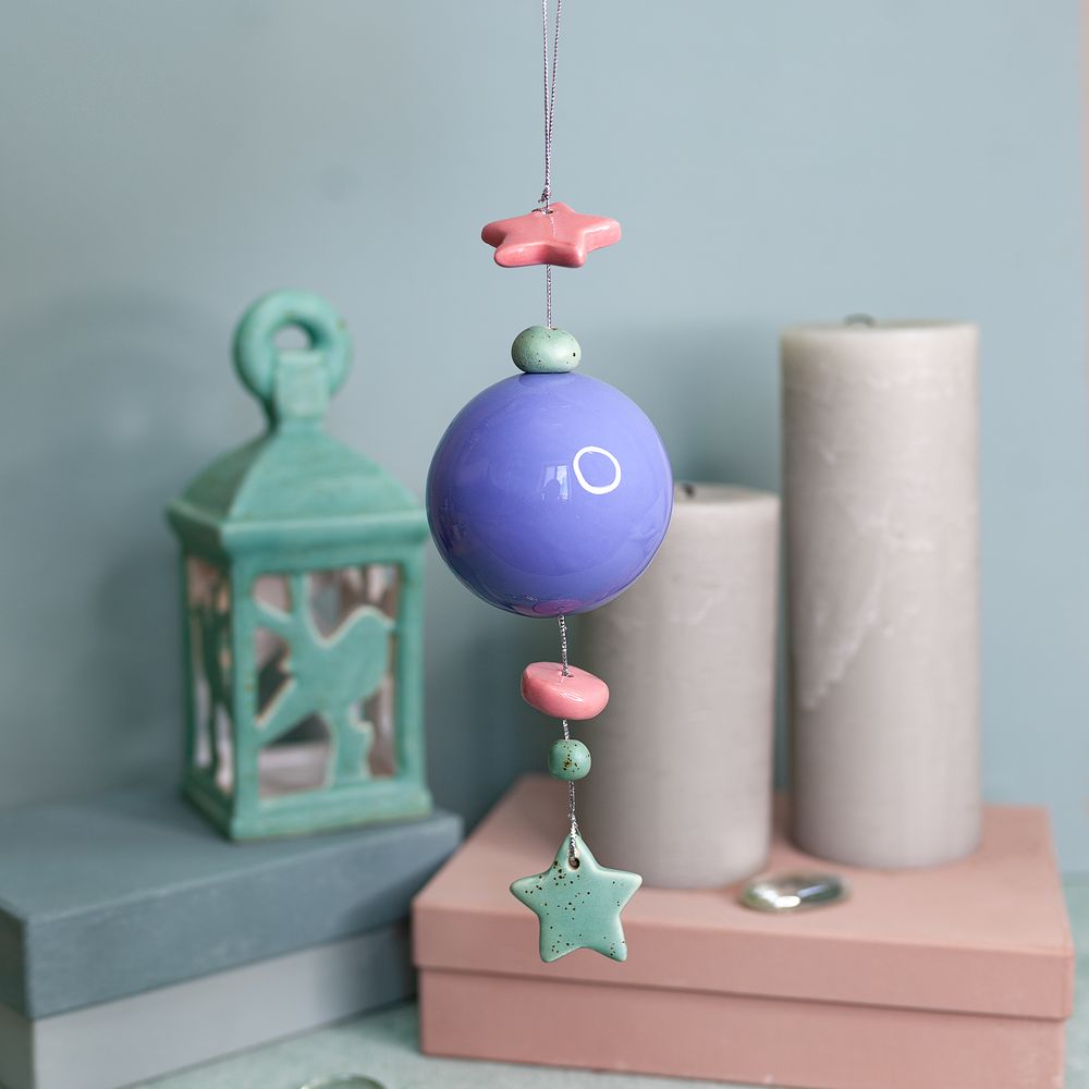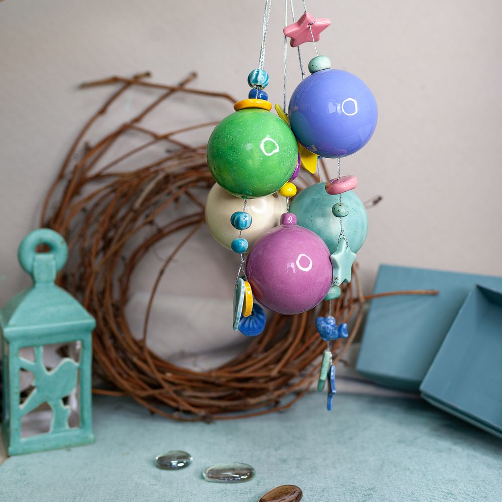 Изделие выполнено в виде традиционного шара с разнообразными многоярусными подвесами, может быть использовано для украшения дома, веранд, садовых беседок. Яркие цвета создают настроение. Декоративные керамические шары оценят те, кто любит свой дом, следуют древней китайской науке фэншуй, идеально подходят для создания тактильного сада – сада звуков, запахов, ощущений.
