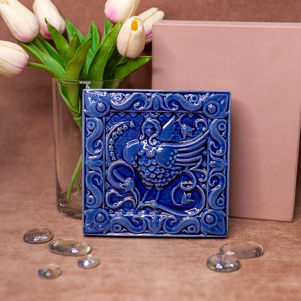 Изделие представляет керамический рельефный элемент квадратной формы, покрытый синей глазурью, на котором нанесено стилизованное изображение райской птицы с головой девы. Птица Сирин обладает прекрасным чарующим голосом. Она покровительствует слабому полу. Сирин символизирует свободу полёта, чистоту и высокую нравственность, её изображения становятся сильнодействующими оберегами и талисманами. Выбранный цвет изразца придает дополнительную смысловую нагрузку изделию, поскольку синий цвет символизирует воду – живительную влагу, без которой нет жизни на Земле. Данное изделие может быть использовано как изразец, и как самостоятельный настенный декор. При этом смотрится стильно и эффектно, может использоваться в местах, где фантазия архитектора или дизайнера по интерьеру не ограничивается типовым решением, он позволяет сделать акцент, привлекающий взгляд, внести завораживающую изюминку в интерьер. Изразец также будет прекрасным подарком родным, близким, коллегам по работе.