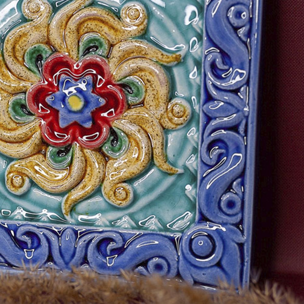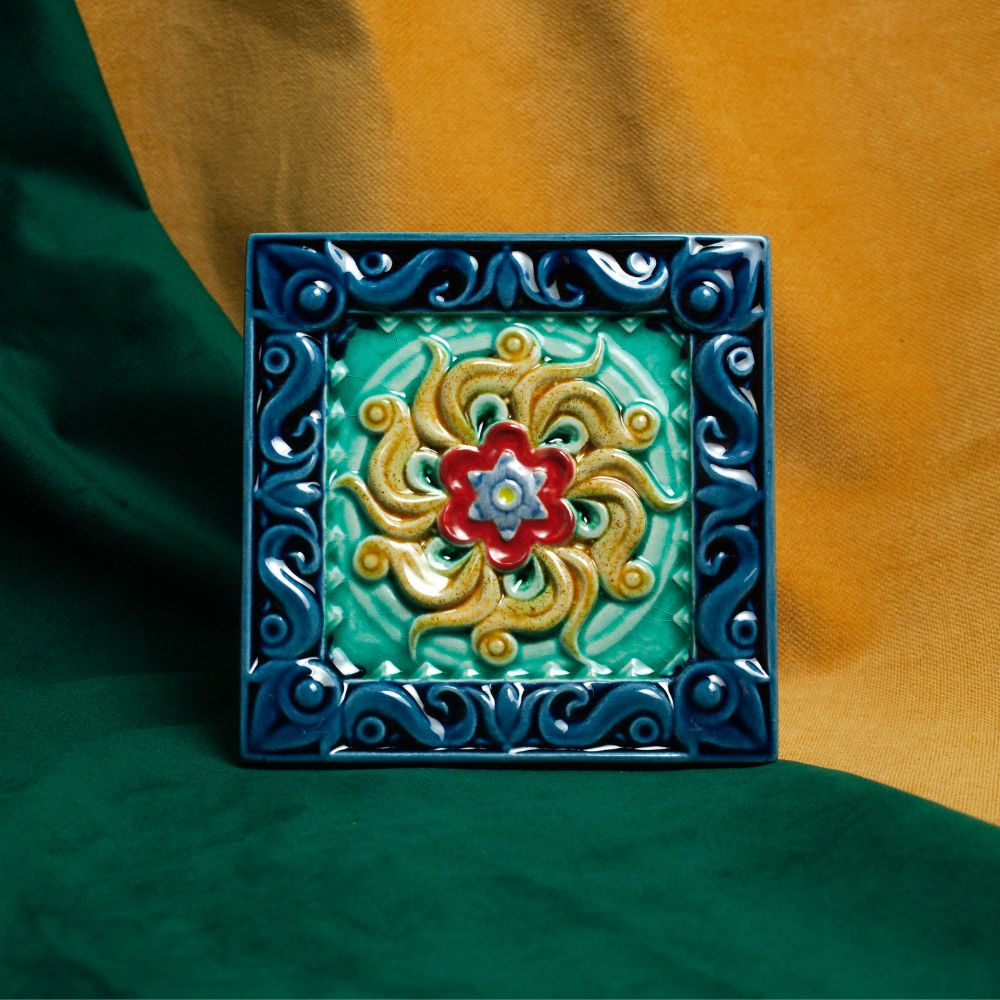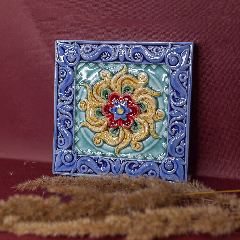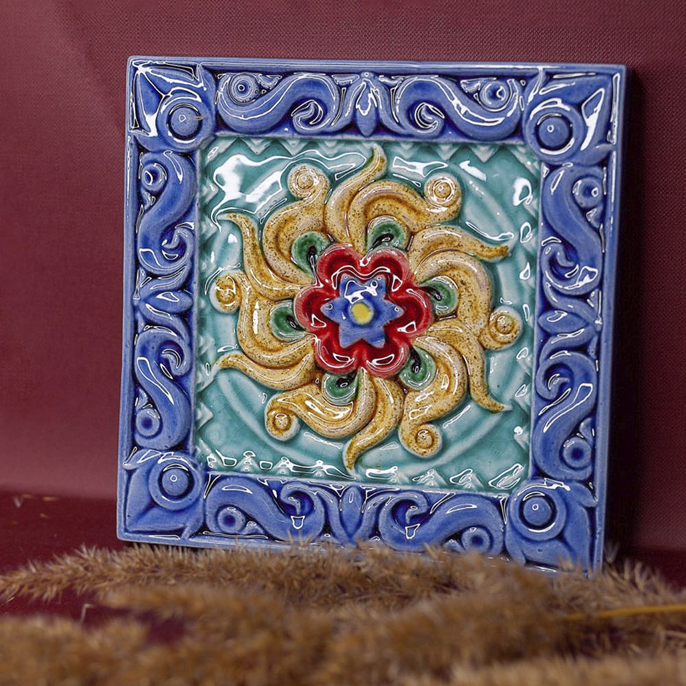 Изделие представляет керамический рельефный элемент квадратной формы, покрытый глазурь. На синем фоне яркими цветными красками нанесено стилизованное изображение цветка лотоса. Лотос — это символ жизни и счастья. Поскольку он поднимается из грязи, сумев не испачкаться, то почти повсеместно является символом чистоты, совершенства и красоты. Лотос – знак женского начала, символ процветания, долголетия, здоровья, жизненной полноты и славы. Данное изделие может быть использовано как изразец, и как самостоятельный настенный декор. При этом смотрится ярко и эффектно, может использоваться в местах, где фантазия архитектора или дизайнера по интерьеру не ограничивается типовым решением, он позволяет сделать акцент, привлекающий взгляд, внести завораживающую изюминку в интерьер. Изразец также будет прекрасным подарком родным, близким, коллегам по работе.