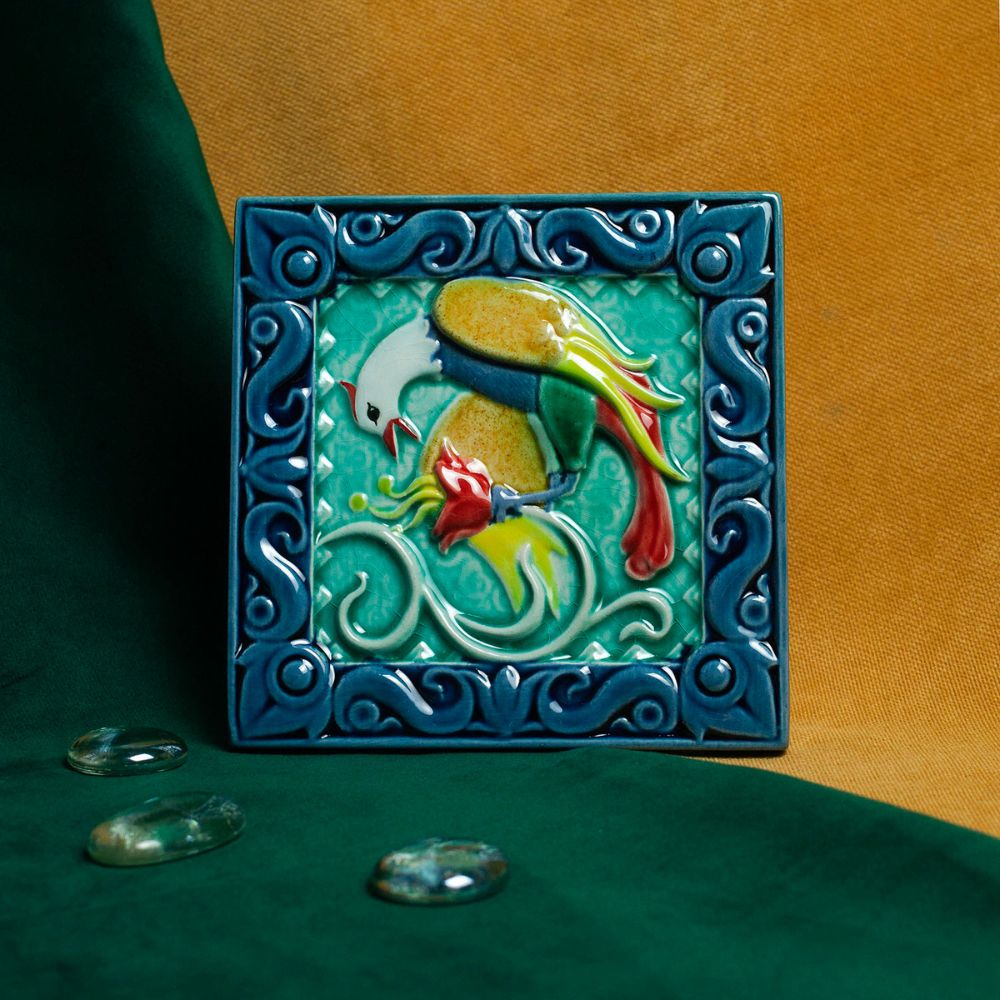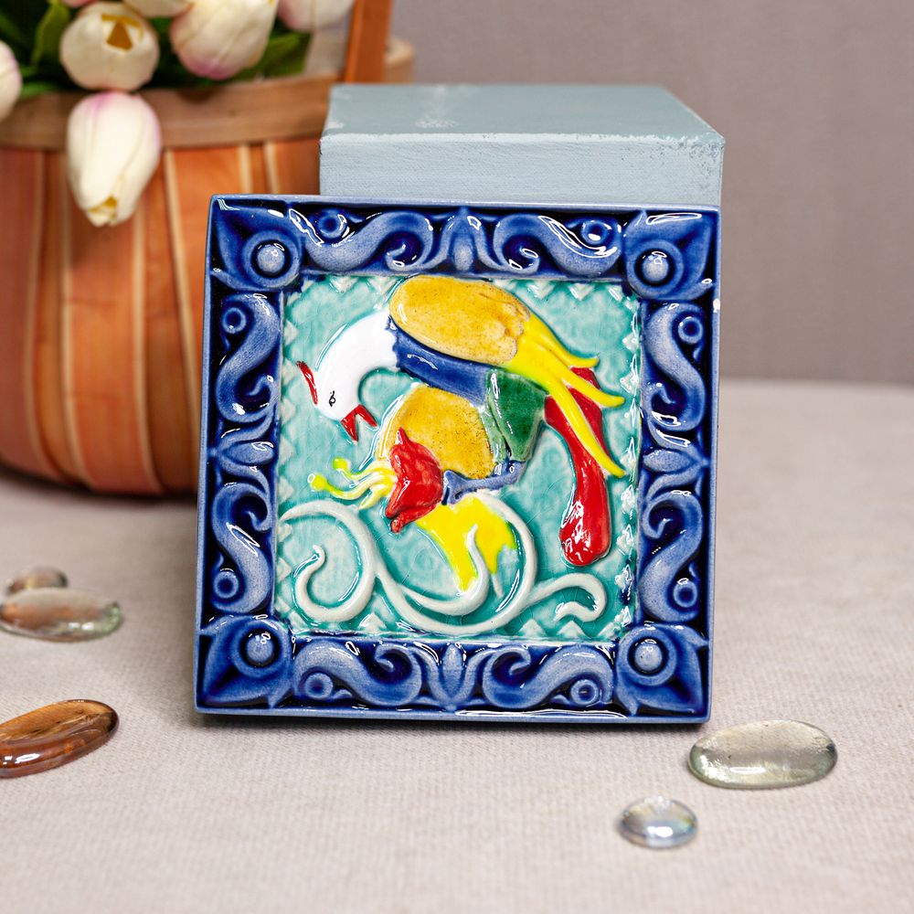 Изделие представляет керамический рельефный элемент квадратной формы, покрытый глазурью. На синем фоне яркими цветными красками нанесено стилизованное изображение птицы, которая пьёт нектар из цветка. По фен шуй птицы символизируют новые возможности. Символы птиц, так же как и символы-цветы обладают внутренней универсальной энергией, приносят в дом удачу, процветание, благополучие и достаток. Данное изделие может быть использовано как изразец, и как самостоятельный настенный декор. При этом смотрится стильно и эффектно, может использоваться в местах, где фантазия архитектора или дизайнера по интерьеру не ограничивается типовым решением, он позволяет сделать акцент, привлекающий взгляд, внести завораживающую изюминку в интерьер. Изразец также будет прекрасным подарком родным, близким, коллегам по работе.