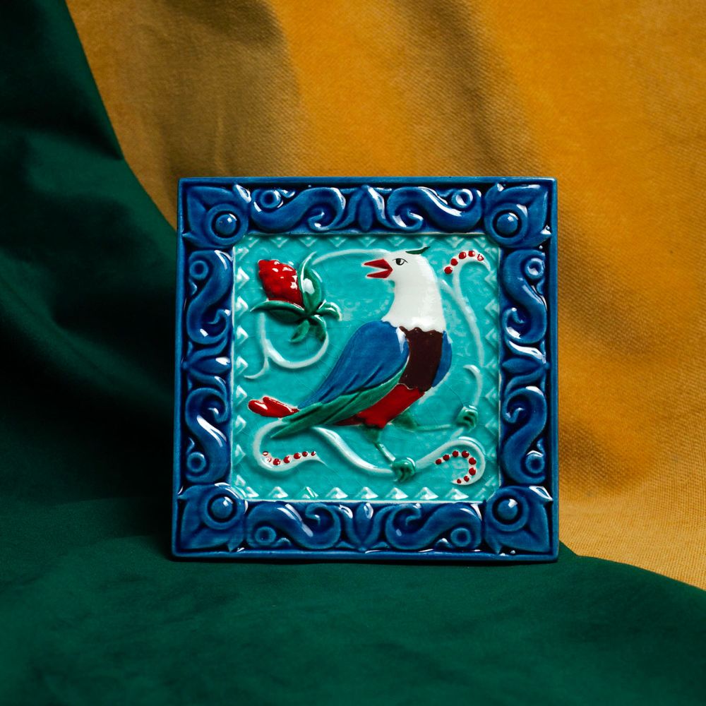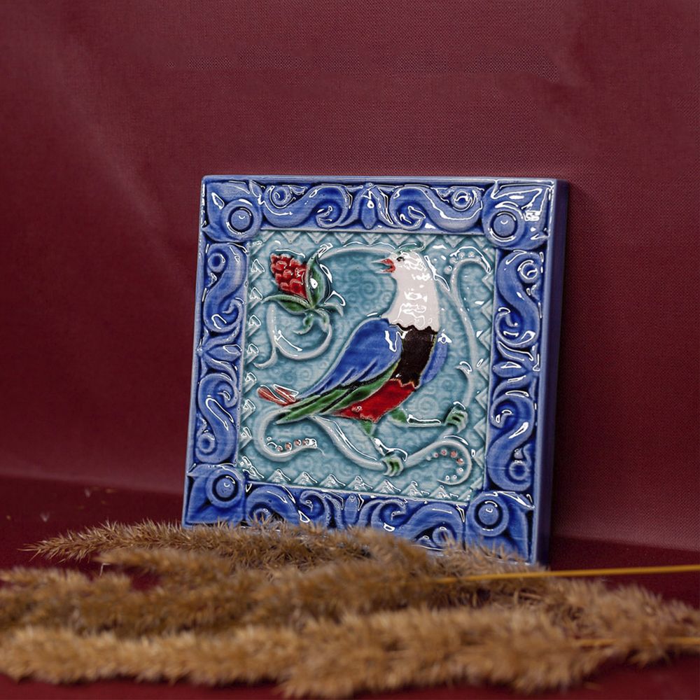 Изделие представляет керамический рельефный элемент квадратной формы, покрытый глазурью. На синем фоне яркими цветными красками нанесено стилизованное изображение соловья, вестника майских дней, певца обновления, утра, певца садов. Соловей – это символ любви и радости, трепетной человеческой души. Оберегает брачные узы, приносит мир в дом. Данное изделие может быть использовано как изразец, и как самостоятельный настенный декор. При этом смотрится стильно и эффектно, может использоваться в местах, где фантазия архитектора или дизайнера по интерьеру не ограничивается типовым решением, он позволяет сделать акцент, привлекающий взгляд, внести завораживающую изюминку в интерьер. Изразец также будет прекрасным подарком родным, близким, коллегам по работе.