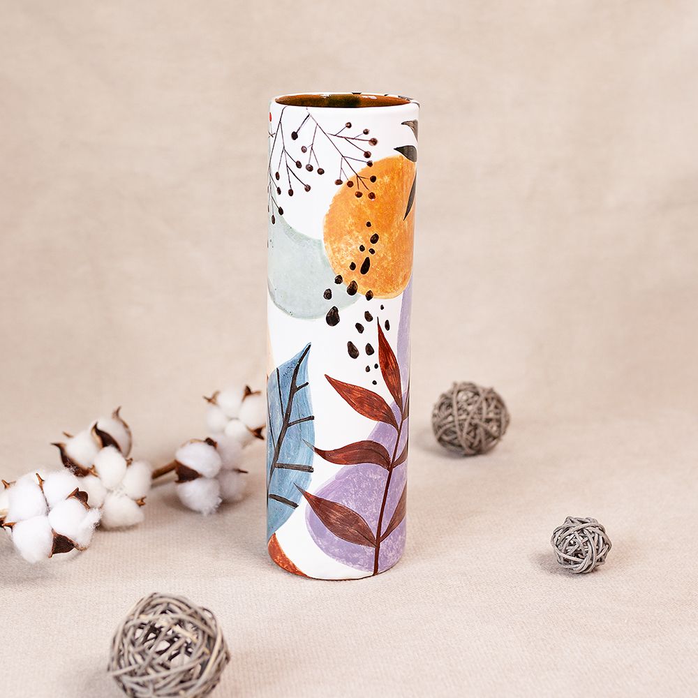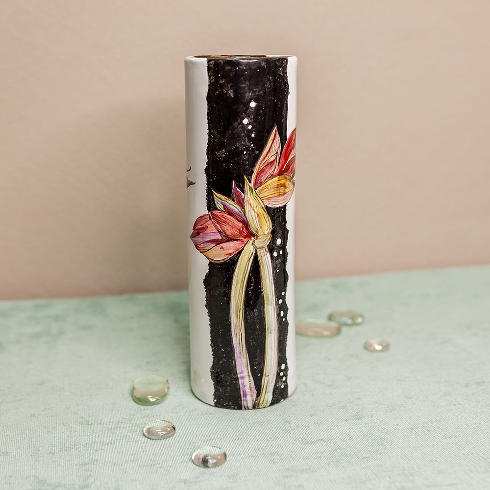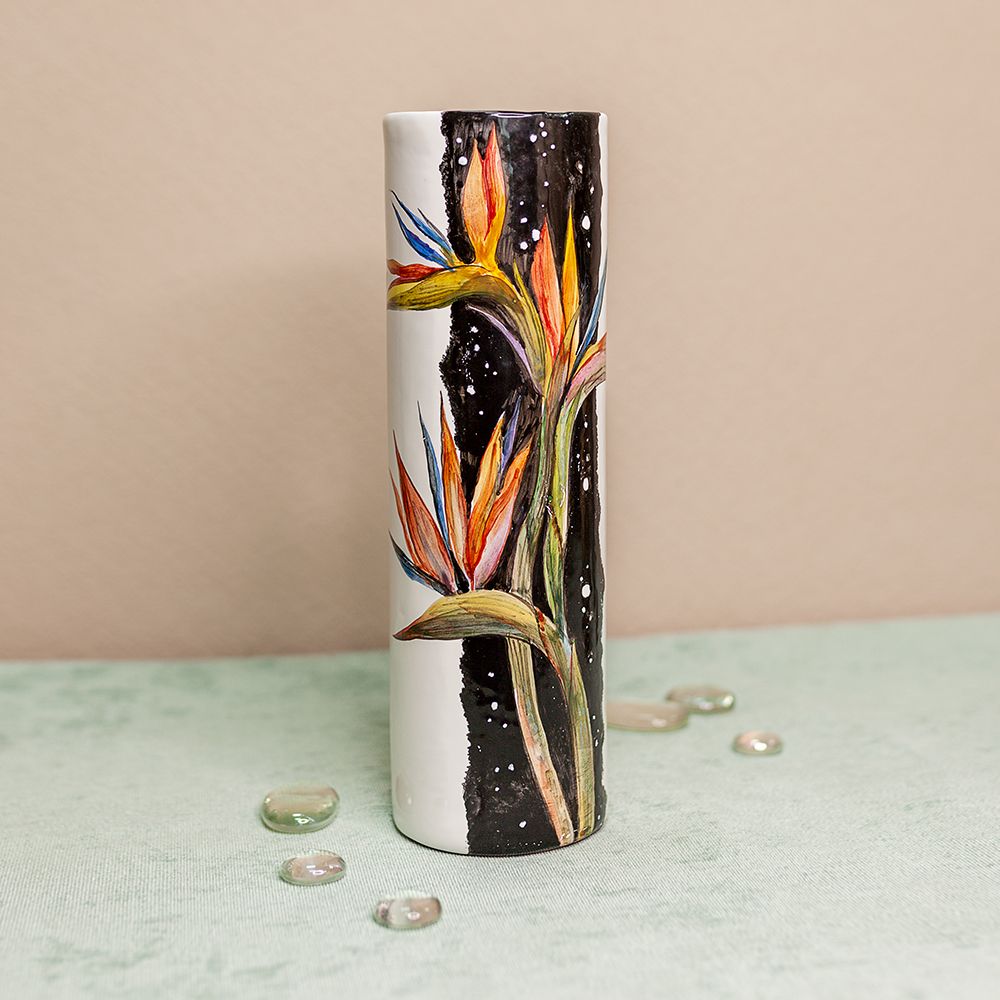 Это изделие ручной работы представляет собой сосуд изящной формы в виде цилиндра. Данное изделие искусно расписано художником. Рисунком может быть как пейзаж, так и цветочная тематика, но каждый раз он будет индивидуален и неповторим. Такая ваза будет стильно смотреться в интерьере, создаст настроение, будет чудесным подарком по любому поводу.