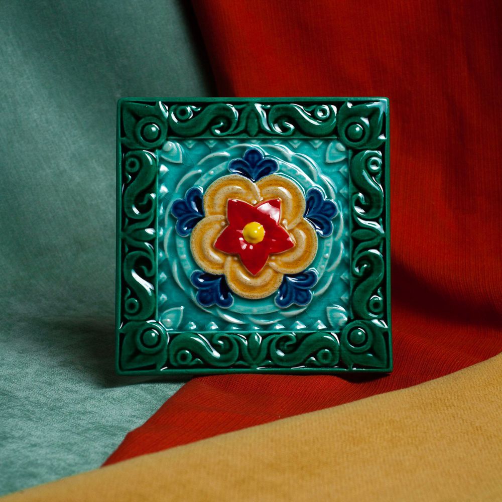 Изделие представляет керамический рельефный элемент квадратной формы, покрытый глазурью. На зеленом фоне яркими цветными красками нанесено стилизованное изображение чертополоха. На Руси отношение к чертополоху всегда было почтительным и мистическим. Это уже видно по названию растения: оно складывается из общеславянских корней “черт” и “полох” (пугать). Магическое значение чертополоха в том, что это сильный оберег, защищающий от опасностей, плохих знакомств, дурного влияния и нечистой силы. Данное изделие может быть использовано как изразец, и как самостоятельный настенный декор. При этом смотрится ярко и эффектно, может использоваться в местах, где фантазия архитектора или дизайнера по интерьеру не ограничивается типовым решением, он позволяет сделать акцент, привлекающий взгляд, внести завораживающую изюминку в интерьер. Изразец также будет прекрасным подарком родным, близким, коллегам по работе.