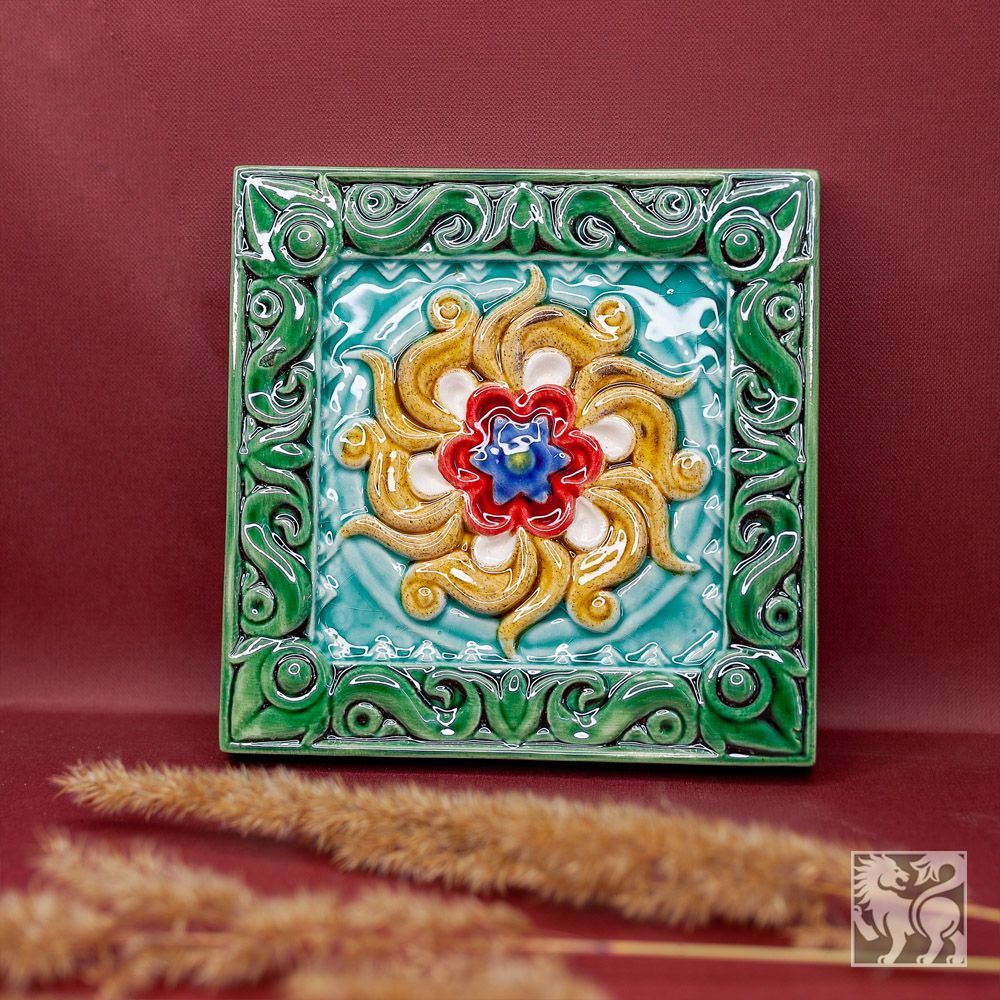 Изделие представляет керамический рельефный элемент квадратной формы, покрытый глазурь. На зеленом фоне яркими цветными красками нанесено стилизованное изображение цветка лотоса. Лотос — это символ жизни и счастья. Поскольку он поднимается из грязи, сумев не испачкаться, то почти повсеместно является символом чистоты, совершенства и красоты. Лотос – знак женского начала, символ процветания, долголетия, здоровья, жизненной полноты и славы. Данное изделие может быть использовано как изразец, и как самостоятельный настенный декор. При этом смотрится ярко и эффектно, может использоваться в местах, где фантазия архитектора или дизайнера по интерьеру не ограничивается типовым решением, он позволяет сделать акцент, привлекающий взгляд, внести завораживающую изюминку в интерьер. Изразец также будет прекрасным подарком родным, близким, коллегам по работе.