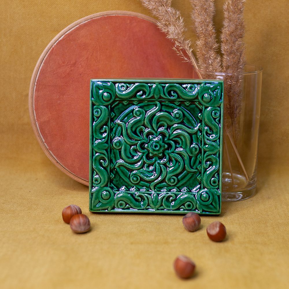 Изделие представляет керамический рельефный элемент квадратной формы, покрытый зеленой глазурью, на котором нанесено стилизованное изображение цветка лотоса. Лотос — это цветок, который каждый вечер закрывает лепестки и скрывается в болотной грязной воде, чтобы вернуться ранним утром, как только первые лучи солнца появятся в небе. Он символизирует возрождение, духовную чистоту и умиротворенность жизни в ее красоте и изяществе. Распуская свой цветок на рассвете, Лотос стал знаком молодости, бессмертия и возобновления жизненных сил. Лотос – знак женского начала, символ процветания, долголетия, здоровья, жизненной полноты и славы. При этом выбранный цвет усиливает символику изделия, поскольку зеленый цвет считается цветом самой жизни. Ведь весной и летом, во время расцвета природы, все буквально утопает в зелени. А зелень – это и будущие плоды, и укрытие от солнечного зноя и диких животных. Поэтому на глубочайшем подсознательном уровне все живые существа воспринимают зеленый цвет как символ безопасности и изобилия. Данное изделие может быть использовано как изразец, и как самостоятельный настенный декор. При этом смотрится ярко и эффектно, может использоваться в местах, где фантазия архитектора или дизайнера по интерьеру не ограничивается типовым решением, он позволяет сделать акцент, привлекающий взгляд, внести завораживающую изюминку в интерьер. Изразец также будет прекрасным подарком родным, близким, коллегам по работе.