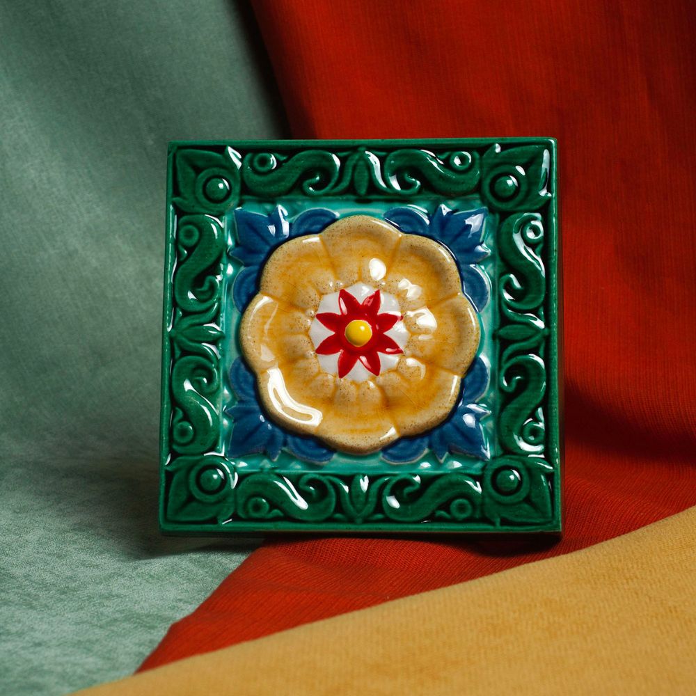 Изделие представляет керамический рельефный элемент квадратной формы, покрытый глазурью, на котором нанесено стилизованное изображение солнца. На зеленом фоне яркими цветными красками нанесено стилизованное изображение солнца. Солнце — это знак мужского начала, созидательной энергии, знаний и интеллекта, величия и храбрости. Выбранный цвет усиливает символику изделия, поскольку синий цвет символизирует воду – живительную влагу, без которой нет жизни на Земле. Данное изделие может быть использовано как изразец, и как самостоятельный настенный декор. При этом смотрится ярко и эффектно, может использоваться в местах, где фантазия архитектора или дизайнера по интерьеру не ограничивается типовым решением, он позволяет сделать акцент, привлекающий взгляд, внести завораживающую изюминку в интерьер. Изразец также будет прекрасным подарком родным, близким, коллегам по работе.