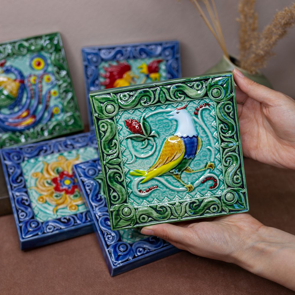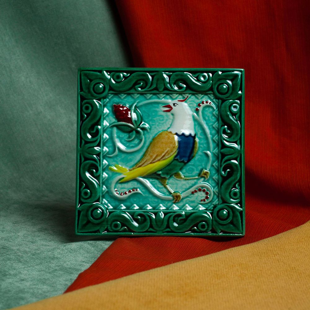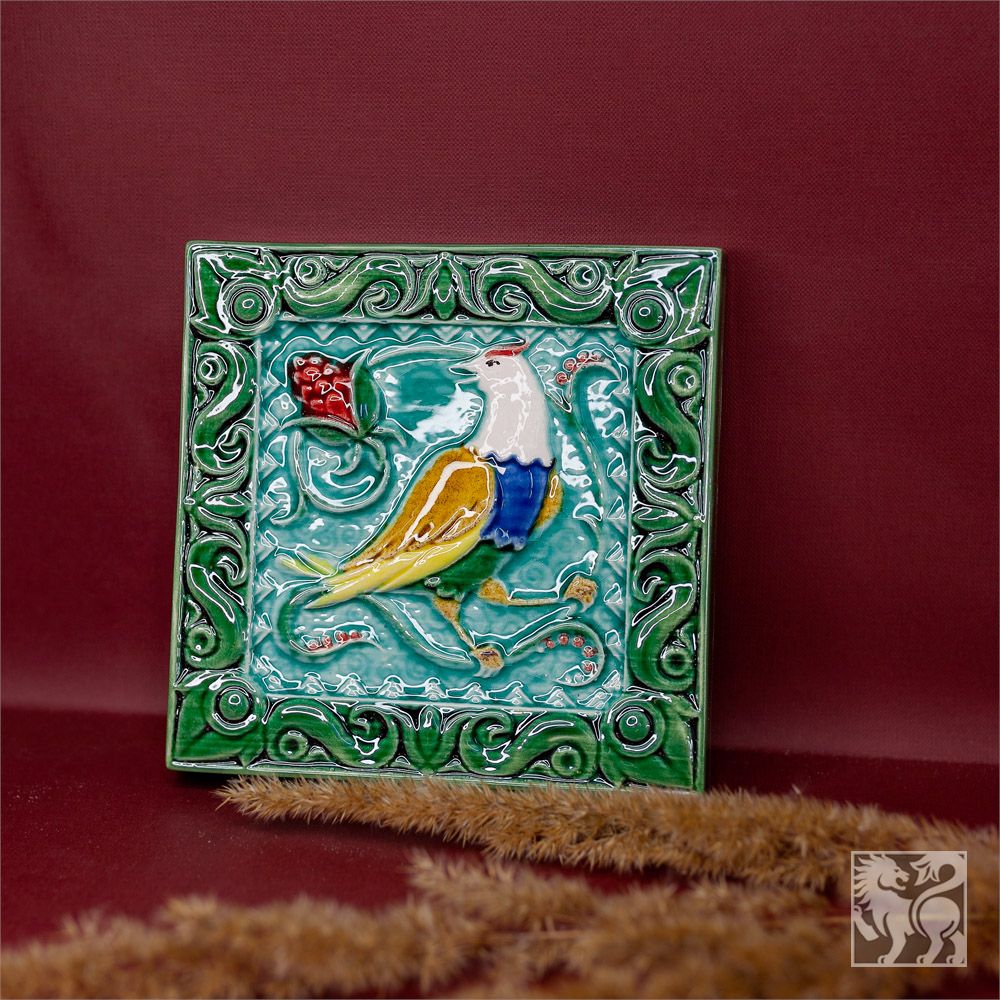 Изделие представляет керамический рельефный элемент квадратной формы, покрытый глазурью. На зелёном фоне яркими цветными красками нанесено стилизованное изображение соловья, вестника майских дней, певца обновления, утра, певца садов. Соловей – это символ любви и радости, трепетной человеческой души. Оберегает брачные узы, приносит мир в дом. Данное изделие может быть использовано как изразец, и как самостоятельный настенный декор. При этом смотрится стильно и эффектно, может использоваться в местах, где фантазия архитектора или дизайнера по интерьеру не ограничивается типовым решением, он позволяет сделать акцент, привлекающий взгляд, внести завораживающую изюминку в интерьер. Изразец также будет прекрасным подарком родным, близким, коллегам по работе.