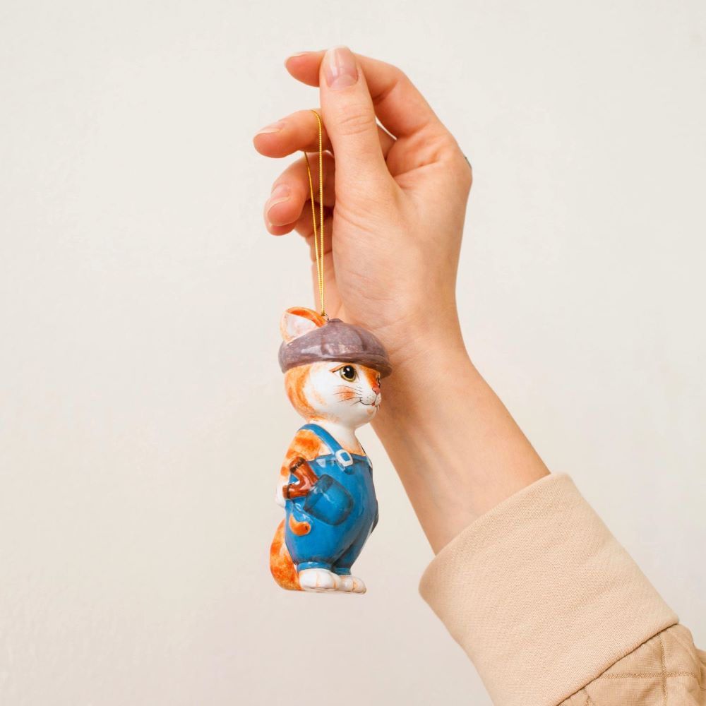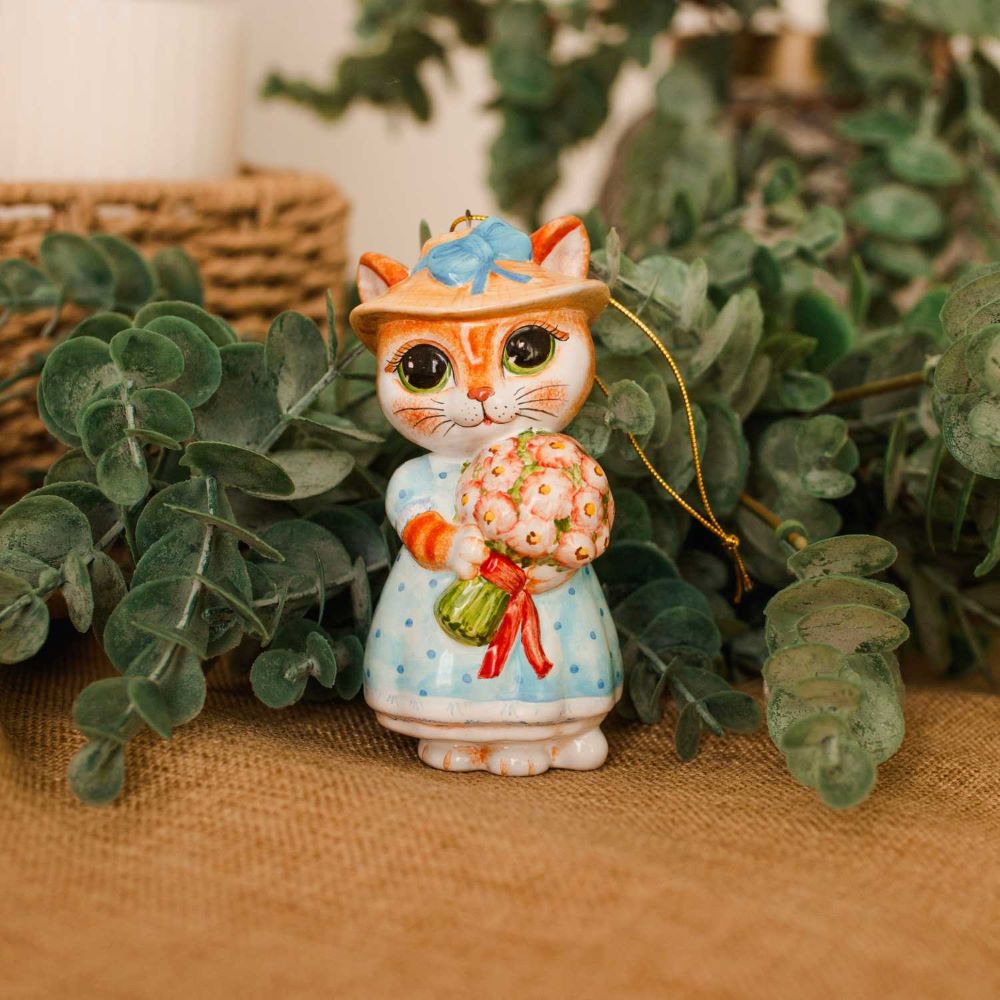 Фигурка “”Кошка с букетом””, выполненная в технике майолика и украшенная ручной художественной росписью, представляет собой милую сцену: кошечка в голубом платье и шляпке прогуливается с подаренным ей букетом цветов. Возможно, этот подарок был от рыжего “”Кота хулигана”” в синих штанишках, который, несмотря на свои проказы, остается неисправимым романтиком. Вместе эти две фигурки создают прекрасную пару, которая в интерьере привнесет весеннее настроение, тепло и уют. Кроме того, изделие может использоваться в качестве украшения новогодней ёлки.”
