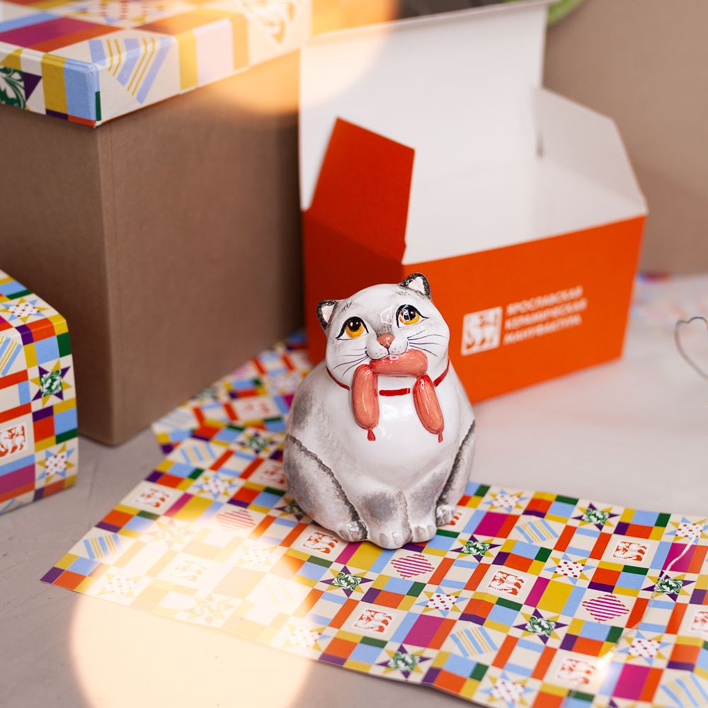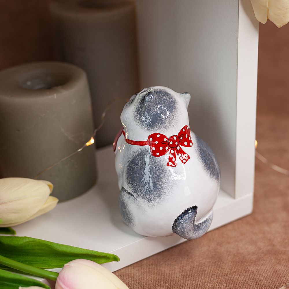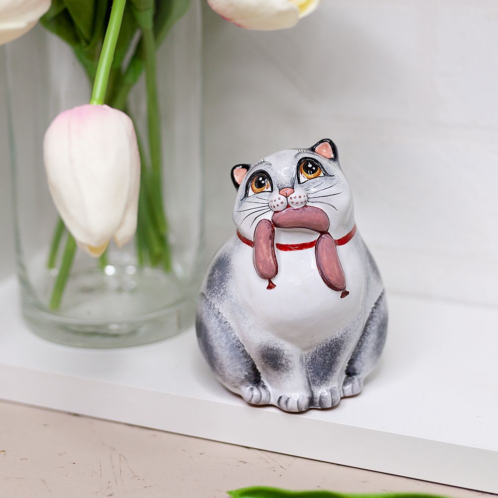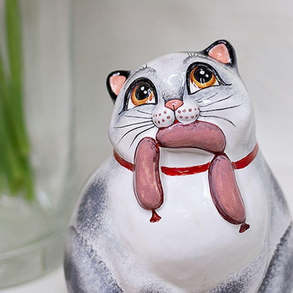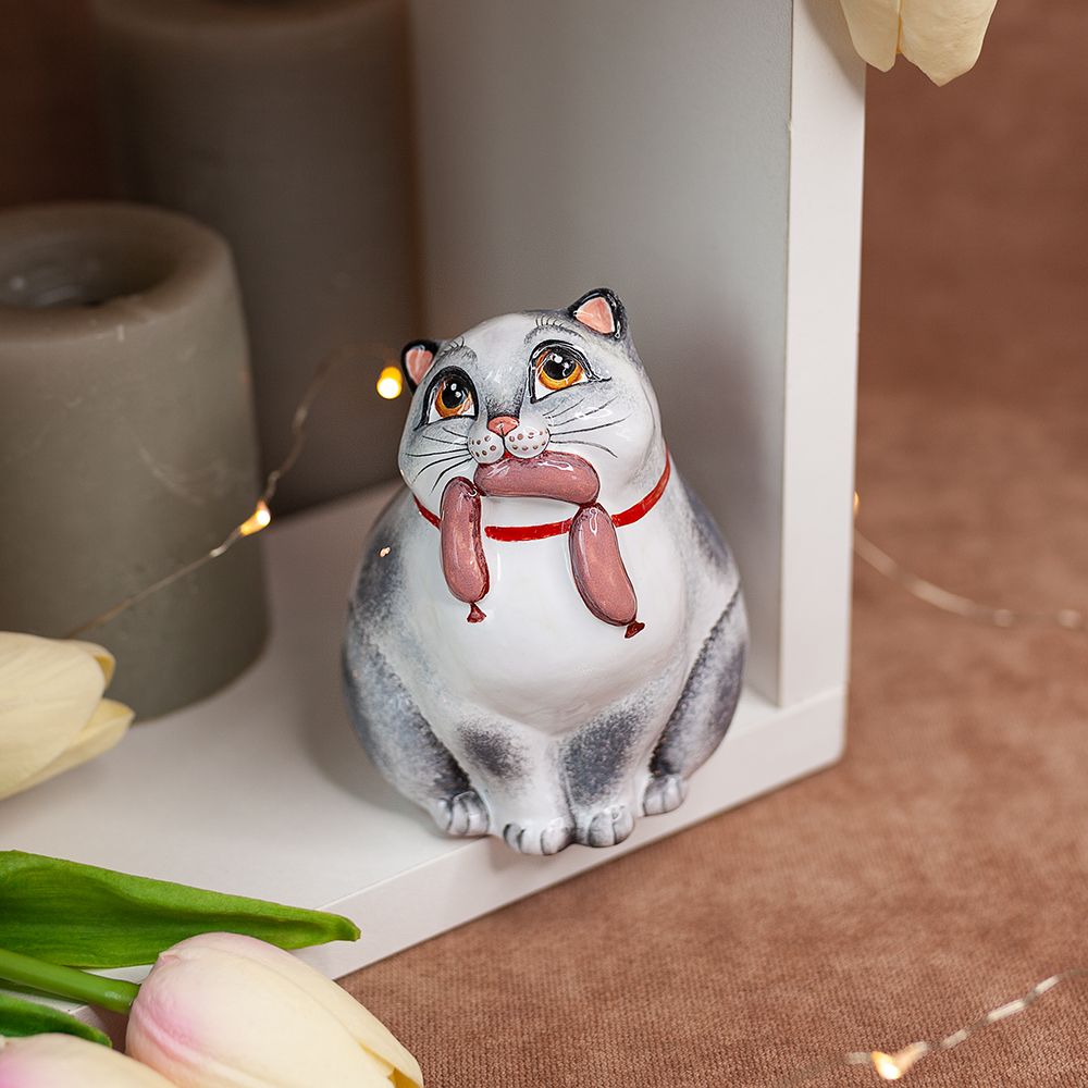 Изделие ручной работы представляет фигурку очаровательной пухлой кошечки с выразительными глазами, в красном ошейнике, которой досталась связка вкусных сосисок. Это милое создание станет очаровательным акцентом при оформлении кухни, создаст настроение, будет чудесным подарком, порадует любителей кошек и коллекционеров.