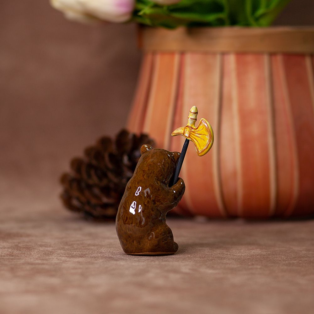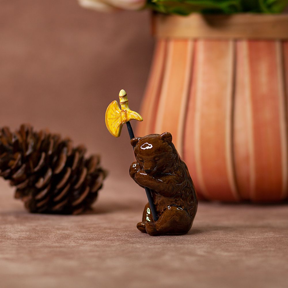 Это изделие ручной работы представляет собой фигурку бурого медвежонка. Медведь — это символ силы, мужества и упорства. Это уникальное животное, и его символ чрезвычайно популярен в легендах многих культур по всему миру. Медведь символизирует и тотемное животное, которому поклонялись язычники, и считали его основателем своего рода, а секира – символ власти и способности к самоорганизации. Медведь с секирой – это геральдический символ Ярославля, который связан с легендой об основании города. Керамическая фигурка медведя будет символическим подарком как для ярославцев, так и для гостей города, она может интересно украсить интерьер, займет достойное место в собрании коллекционеров.