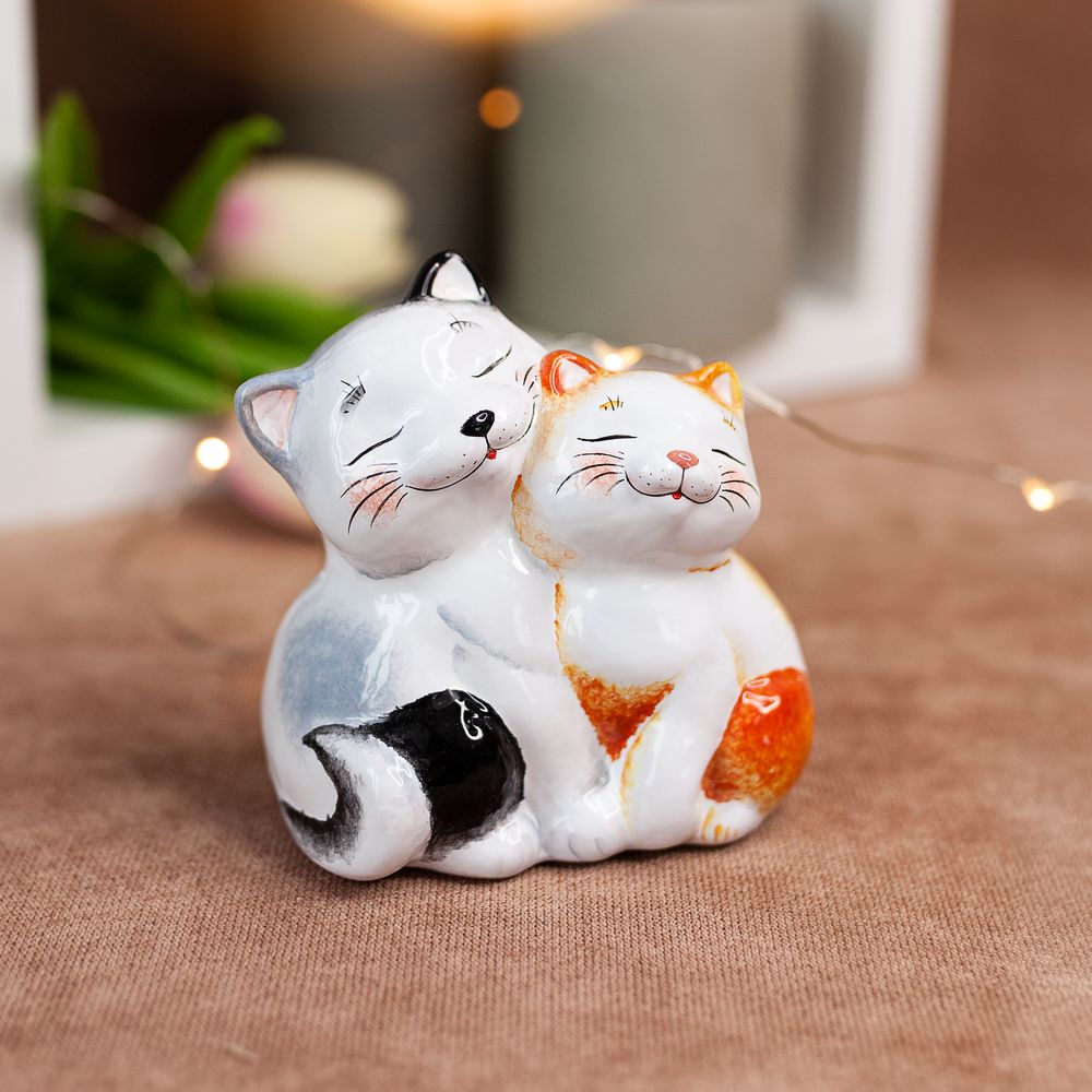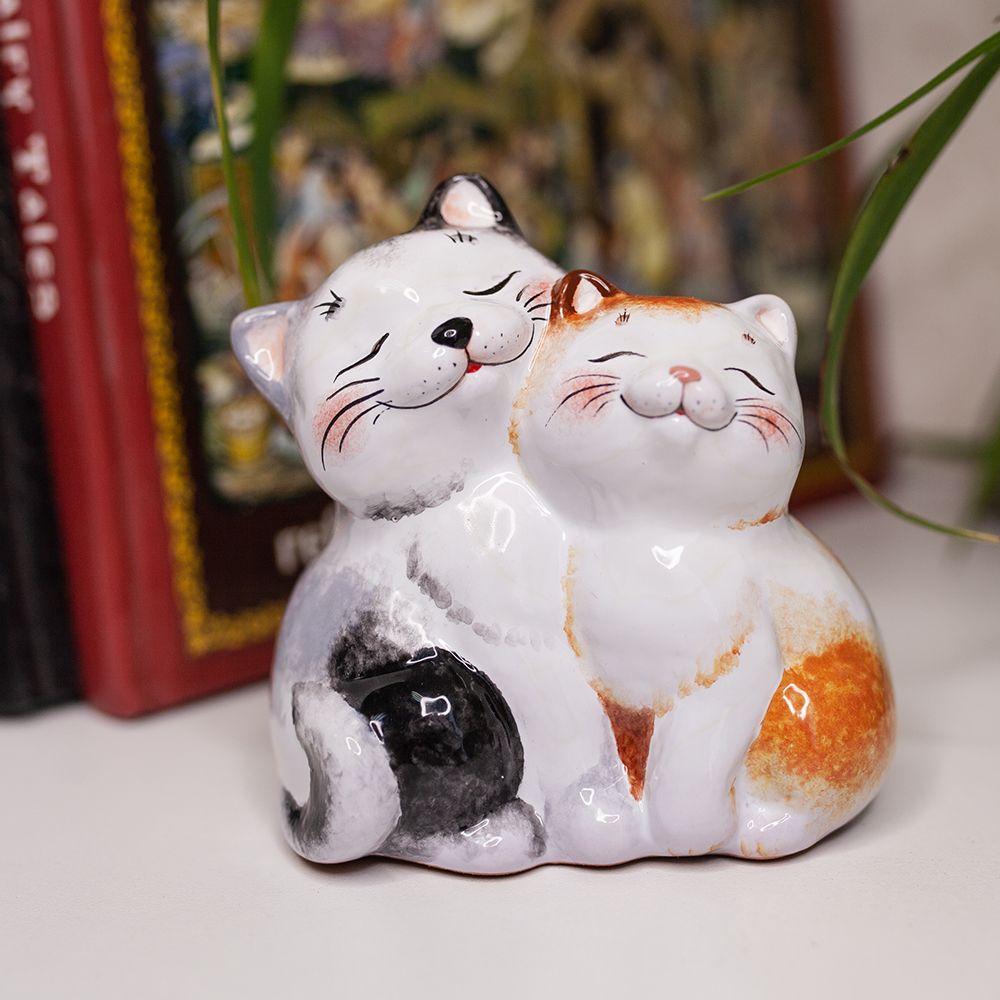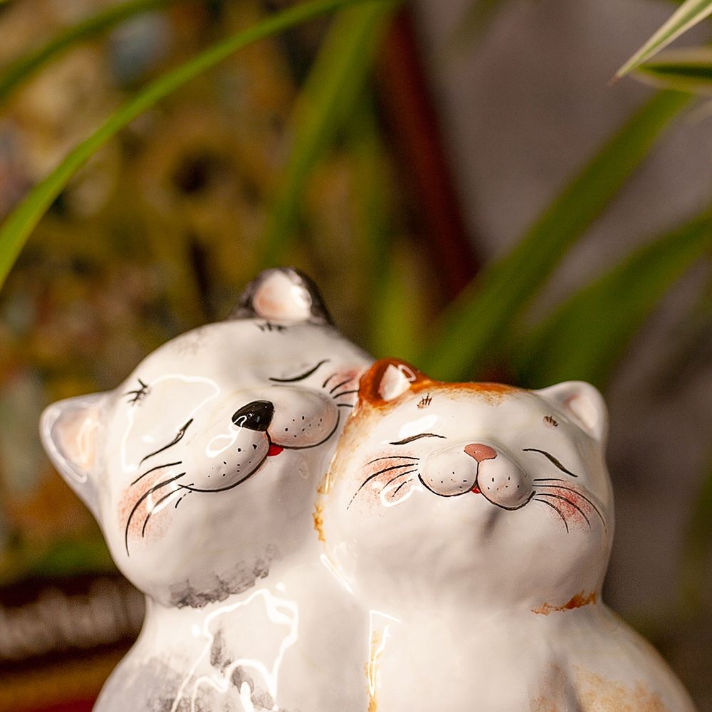 Парная фигурка “Кот с Кошкой “Пушистая любовь”, выполнена в технике майолика и украшена ручной художественной росписью. Очаровательная парочка керамических кота и кошки, которые уютно мурлыкают, наслаждаясь обществом друг друга. Эти милые фигурки станут интересным акцентом в вашем интерьере, добавят уюта и тепла, создадут особую атмосферу радости. Фигурка станет замечательным подарком для коллекционеров, любителей животных или просто тех, кто ценит уникальные и ручные изделия.