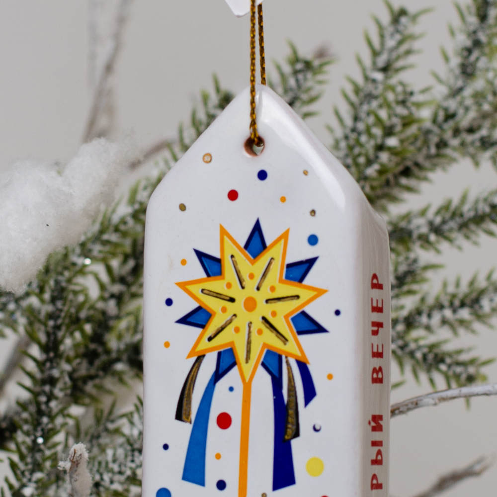 Подвес-конфета “Желтая звезда”- изделие ручной работы, украшенное авторской деколью, входящее в состав коллекции “Колядки”.