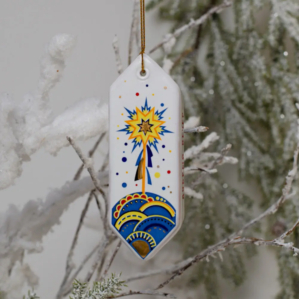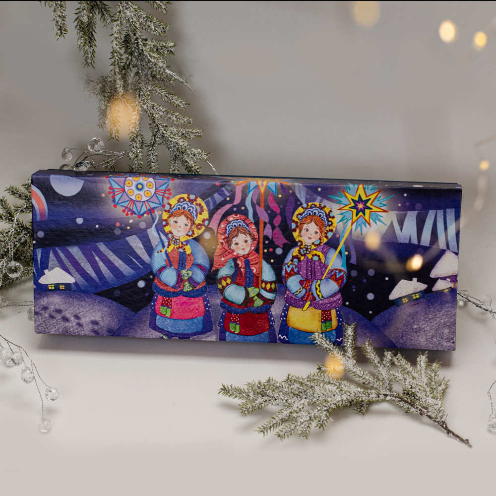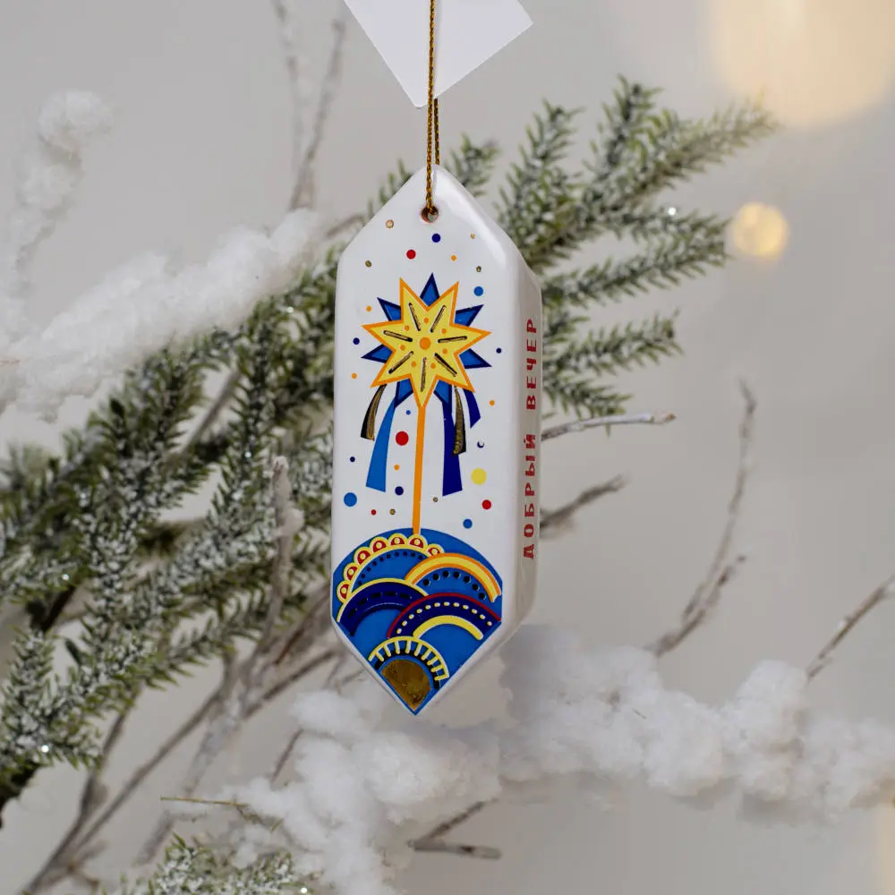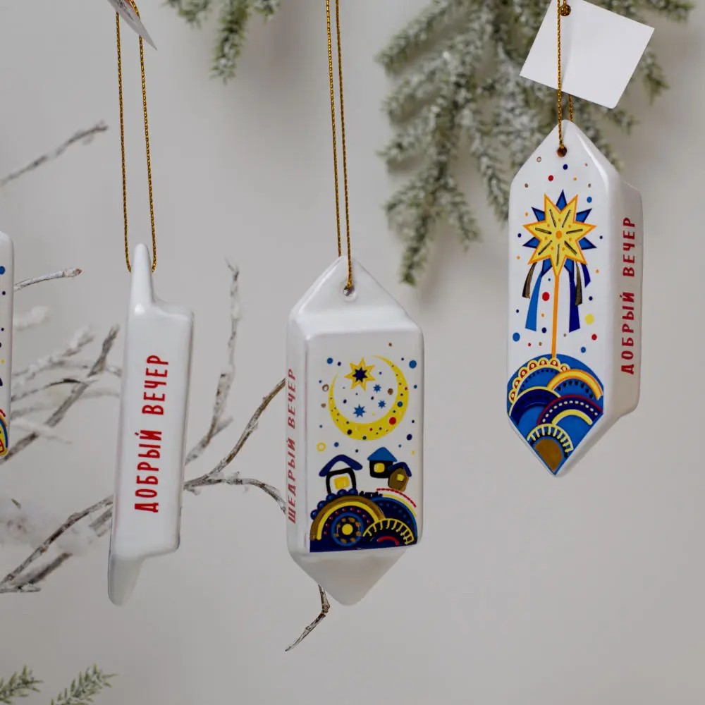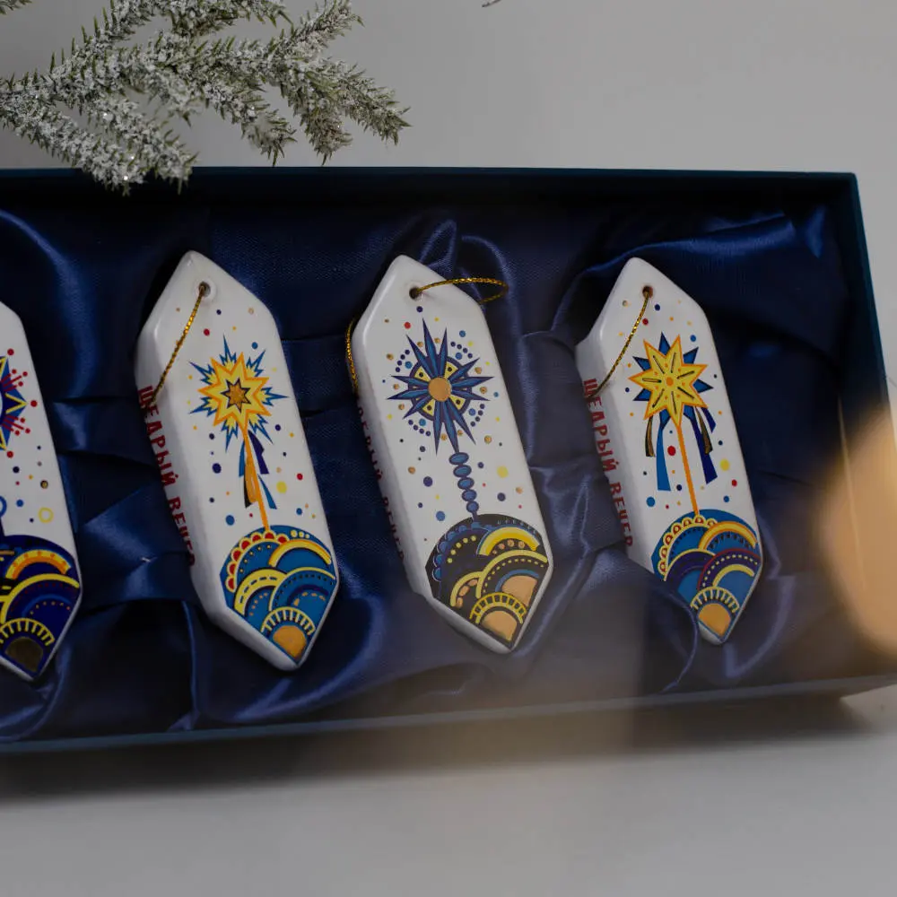 Набор подвесов “Конфеты” из коллекции “Колядки” — изделия ручной работы, украшенные авторской деколью. В состав набора входит пять изделий: “Красная снежинка”, “Желтая снежинка”, “Фиолетовая снежинка”, “Желтая звезда”, “Синяя звезда”.