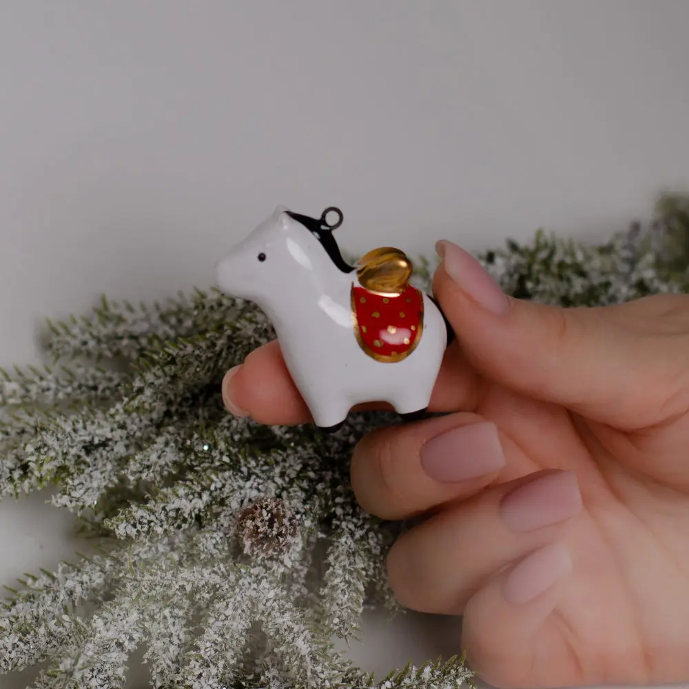 Подвес “Лошадка с крылышками” (с золотом) изготовлена в технике майолика, украшена ручной художественной росписью и золотом, и входит в коллекцию подвесов “Для маленькой елочки”. Фигурка создана вручную с тщательностью и вниманием к деталям, что делает ее поистине уникальной.