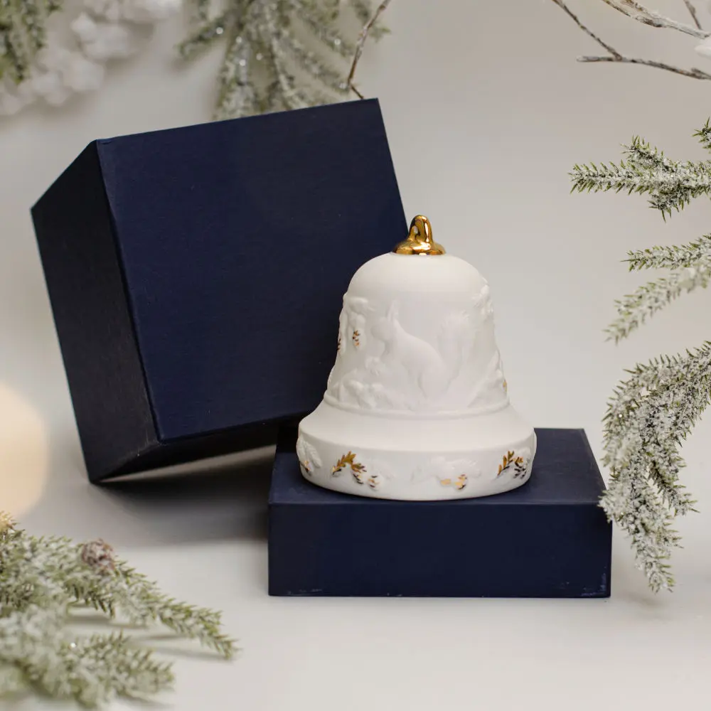 Изящный елочный подвес “Колокольчик” с рельефным изображением белок, выполнен из фарфора бисквита и украшен ручной художественной росписью золотом.
