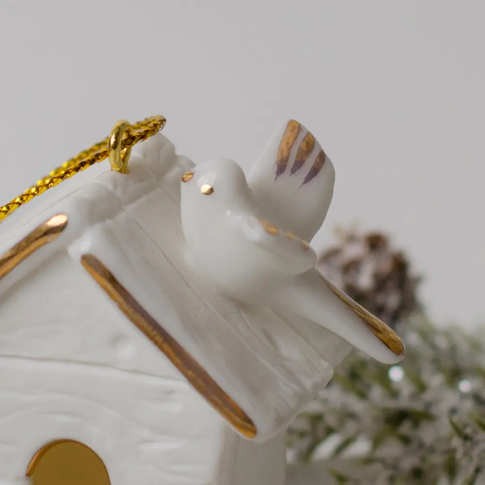 Подвес “Скворечник”, выполнен из фарфора бисквита и украшен тонкой художественной росписью золотом, придающей ему особое благородство.