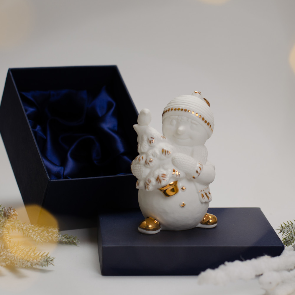 Интерьерная фигурка “Снеговик” — изделие ручной работы, представляет собой снеговика с елкой на плече, украшенного ручной художественной росписью золотом.