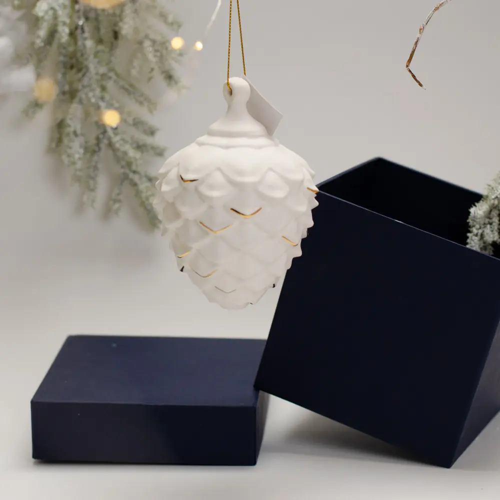 Изящный елочный подвес “Шишка”, выполнен из фарфора бисквита и украшен ручной художественной росписью золотом. Шишка символизирует плодородие, возрождение и начало новой жизни, наполняя праздник глубоким смыслом.