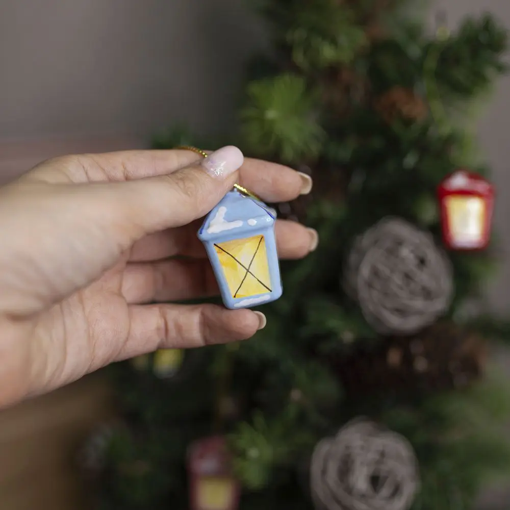 Изделие ручной работы представляет собой голубой фонарик. Фонарь – изобретение, изменившее жизнь людей. Любой фонарь символизирует победу света над тьмой, раздвигая рамки времени, отведенного для активной деятельности человека. Наш волшебный фонарик станет нарядным украшением для зеленой красавицы елки, будет милым подарком. Красная глина, белая эмаль, высокотемпературный обжиг, художественная роспись.