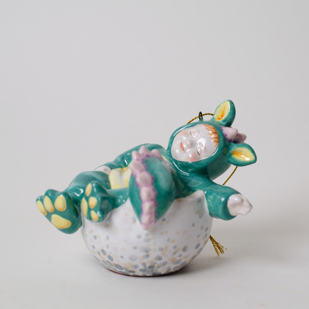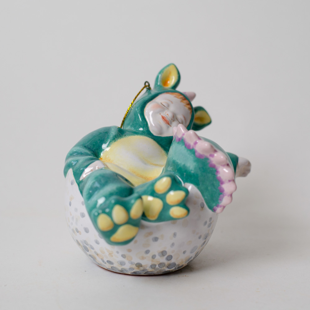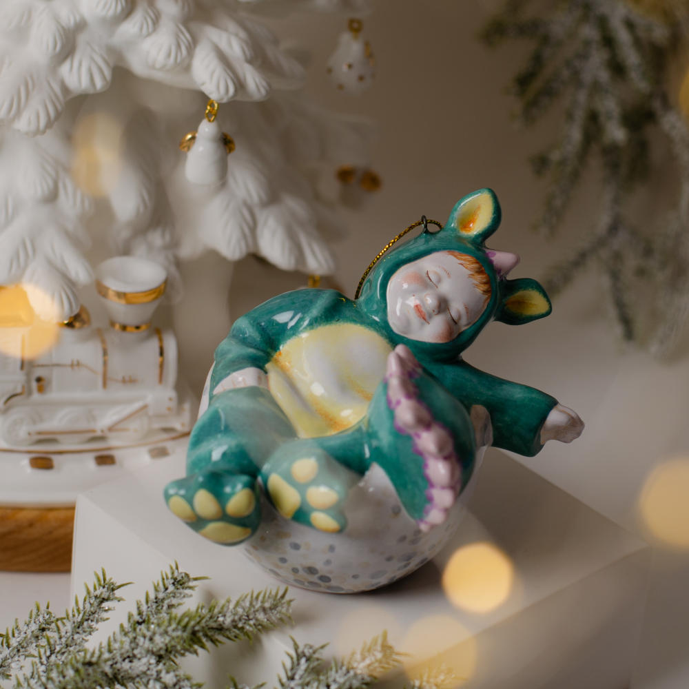 Фигурка “Малыш – дракоша”, ручной работы и росписи, выполнено в технике майолика и входит в коллекцию “Малыши”. Изделие представляет собой спящего карапуза в костюме дракончика, который словно приглашает вас в мир сказки. Мастерски расписанная фигурка, реалистично передает нежность и безмятежность детского личика. Пушистый бирюзовый костюмчик выполнен с великолепной передачей фактуры. Игрушка станет оригинальным новогодним украшением и год за годом будет дарить вам праздничное настроение. Это прекрасный коллекционный подарок для друзей и близких, который будет приятно передать по наследству. Также, вы можете собрать нашу коллекцию елочных игрушек “Детки в костюмах”.