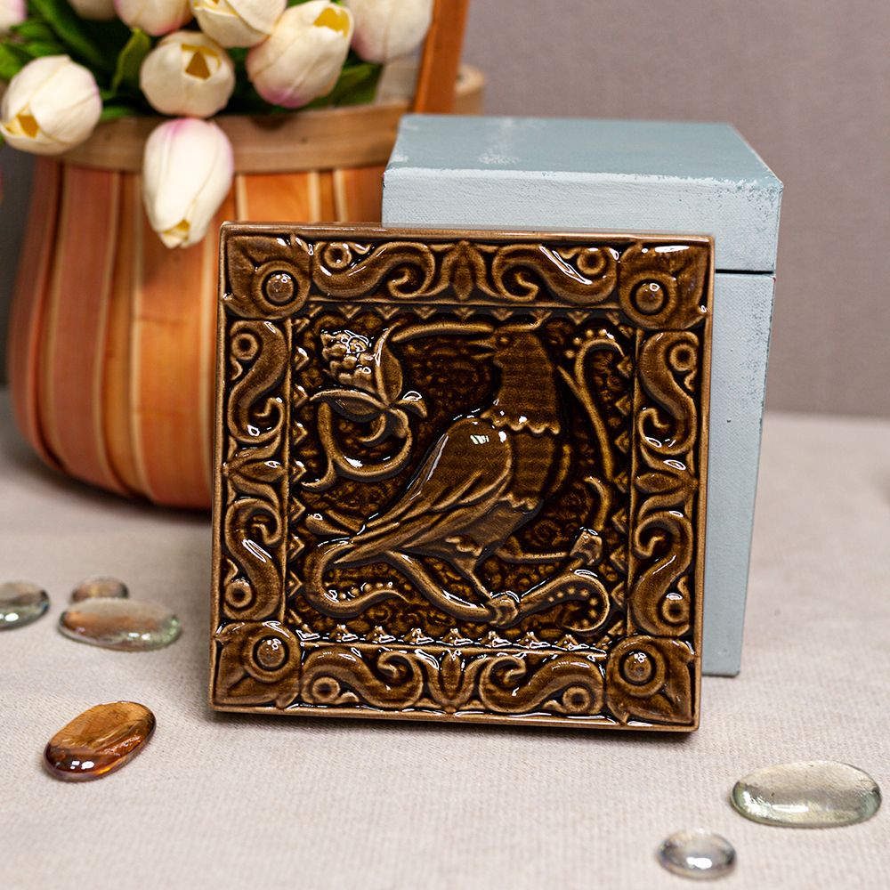 Изделие представляет керамический рельефный элемент квадратной формы, покрытый коричневой глазурью, на котором нанесено стилизованное изображение соловья, вестника майских дней, певца обновления, утра, певца садов. Соловей – это символ любви и радости, трепетной человеческой души. Оберегает брачные узы, приносит мир в дом. При этом выбранный цвет придает дополнительную смысловую нагрузку изделию, поскольку коричневый цвет символизирует плодородие, основательность, устойчивость и стабильность. Данное изделие может быть использовано как изразец, и как самостоятельный настенный декор. При этом смотрится стильно и эффектно, может использоваться в местах, где фантазия архитектора или дизайнера по интерьеру не ограничивается типовым решением, он позволяет сделать акцент, привлекающий взгляд, внести завораживающую изюминку в интерьер. Изразец также будет прекрасным подарком родным, близким, коллегам по работе.