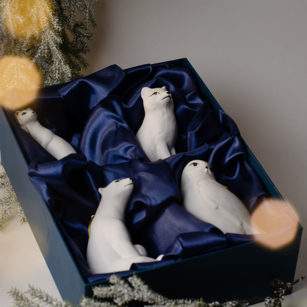 Откройте для себя красоту ручной работы с набором “Полярные” — комплектом из четырёх керамических фигурок, созданным из фарфора бисквита, который придаёт изделиям особую текстуру, а акценты на деталях фигурок выполнены ручной росписью глазурями. Мастера уделили особое внимание мельчайшим деталям, чтобы передать натуралистичность каждого животного.
