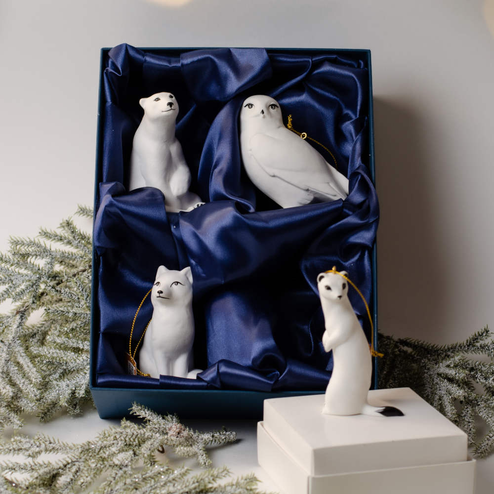 В набор входят: белый медведь, песец, полярная сова и горностай — символы сурового северного края.