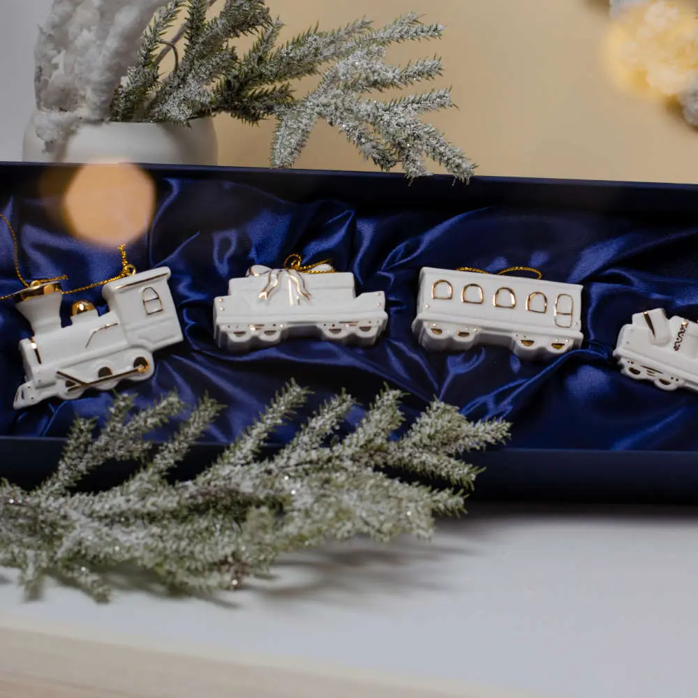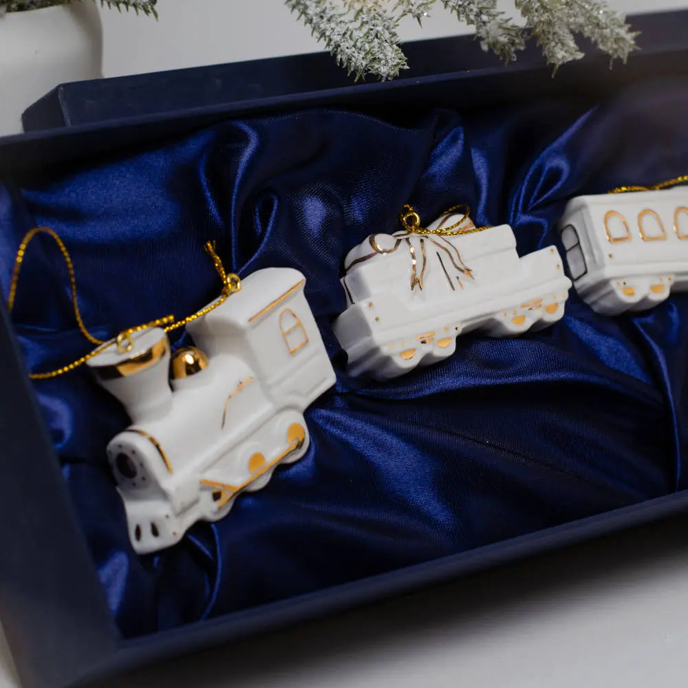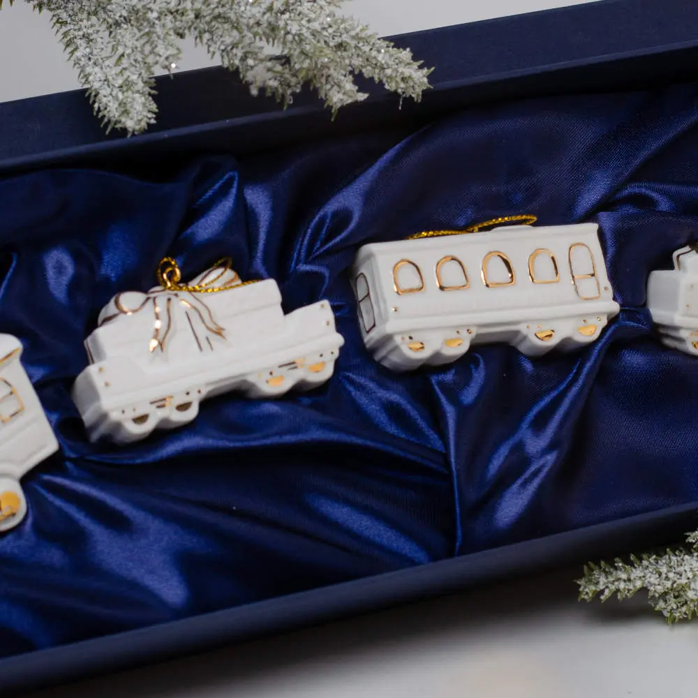 Набор подвесов “Паровоз и три вагончика” — это изысканная композиция, воплощающая дух путешествия и волшебства зимних праздников. Все элементы выполнены вручную из фарфора бисквита и украшены росписью золотом. Матовый фарфор мягко рассеивает свет гирлянд, а тонкие золотые линии создают ощущение тепла и роскоши.