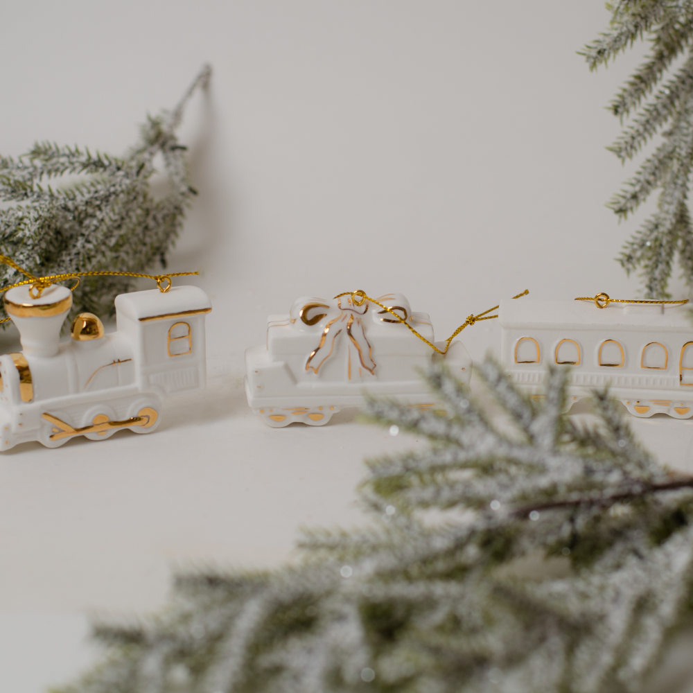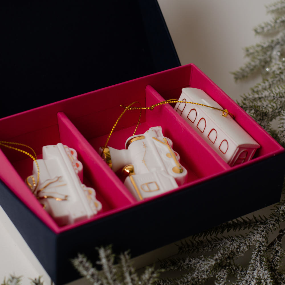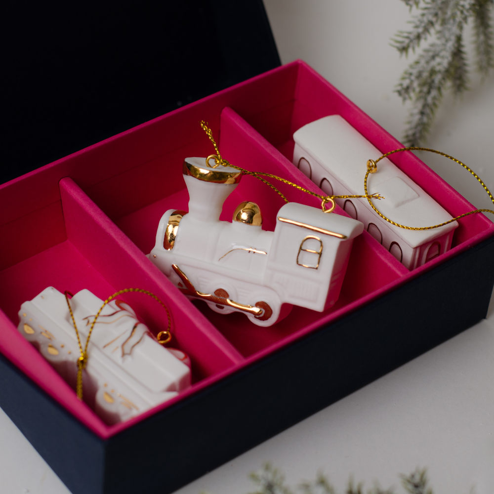 Подвесы из набора “Паровозик, Вагончик, Вагончик с большим подарком” выполнены вручную из бисквитного фарфора и украшены изящной росписью золотом. Матовая текстура бисквита дарит изделиям нежный бархатистый оттенок, который прекрасно контрастирует с блеском золота, создавая образ утончённости и благородства.