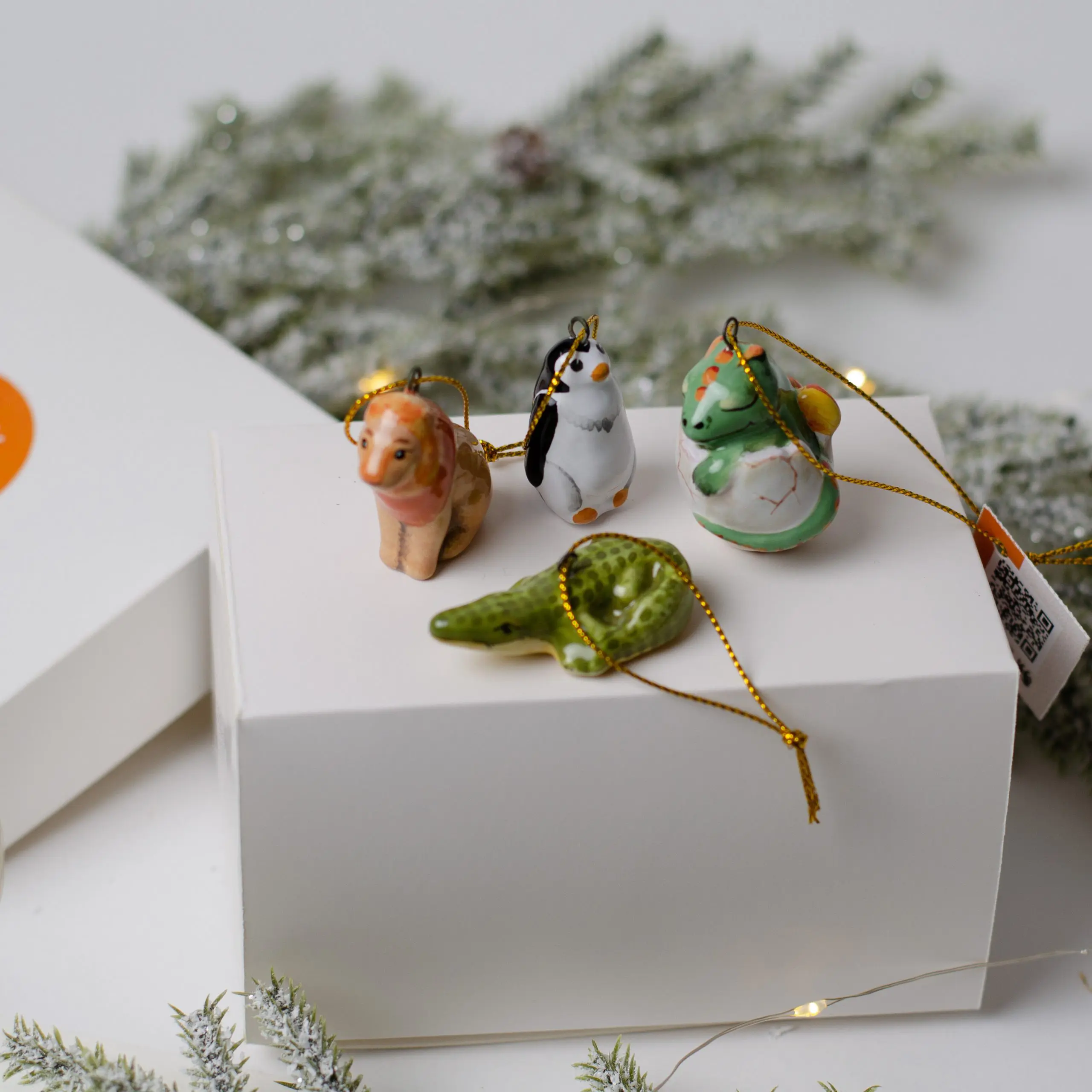 Окунитесь в атмосферу зимнего чуда с нашим элегантным набором елочных украшений №9. В этот комплект входят четыре фигурки: Дракон в яйце, Лев, Пингвин, Крокодил. Набор является частью коллекции миниатюрных новогодних украшений “Игрушки для маленькой елочки”.
