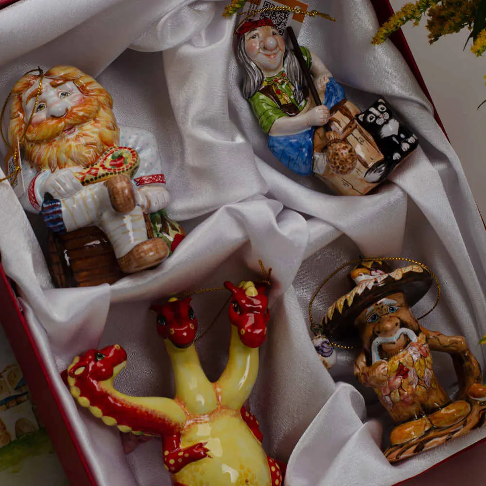 Подарочный набор “Сказки”, выполнен в технике майолика и украшен ручной художественной росписью. В состав набора входят четыре изделия: Домовой, Баба Яга, Леший, Змей Горыныч.