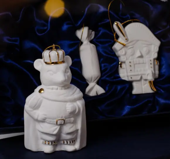 Подвесы в наборе “Щелкунчик, конфета, лошадка”, изготовлены вручную из фарфора бисквита и украшены художественной росписью золотом. Текстура фарфора придает им мягкий матовый оттенок, который прекрасно сочетается с золотом, создавая эффект благородства и изысканности.